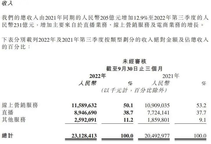 同时,从快手收入比例也可以看出端倪。根据财报数据显示,第三季度,快手线上营销服务(即广告)、直播和其他服务(含电商)对收入的贡献占比分别为50.1%、38.7%和11.2%。