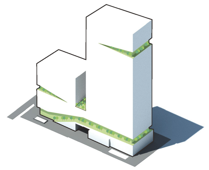酒店体块被插入通高的中庭,整体有效利用架空层、避难层增加室外绿植。既打造了立体开放活动空间,又融入绿色通风的概念,让整个建筑呼吸起来。