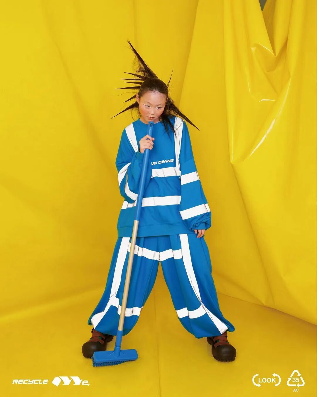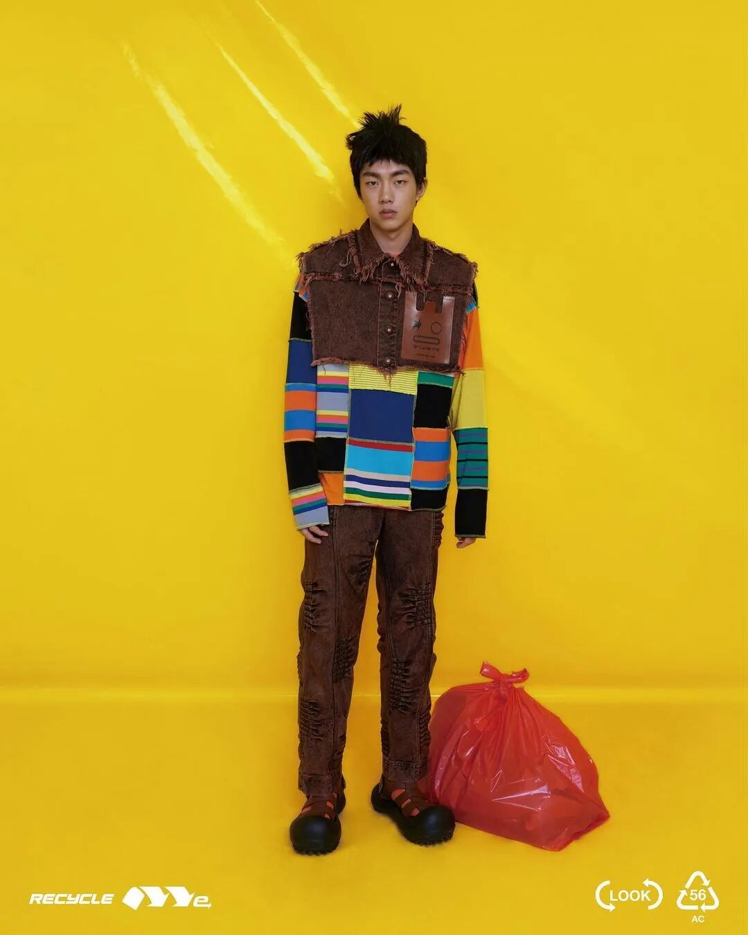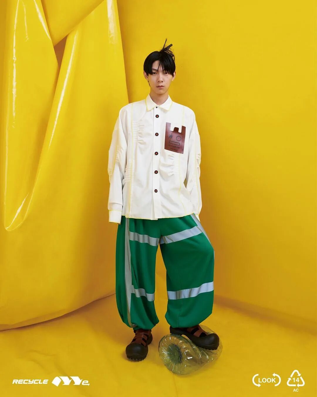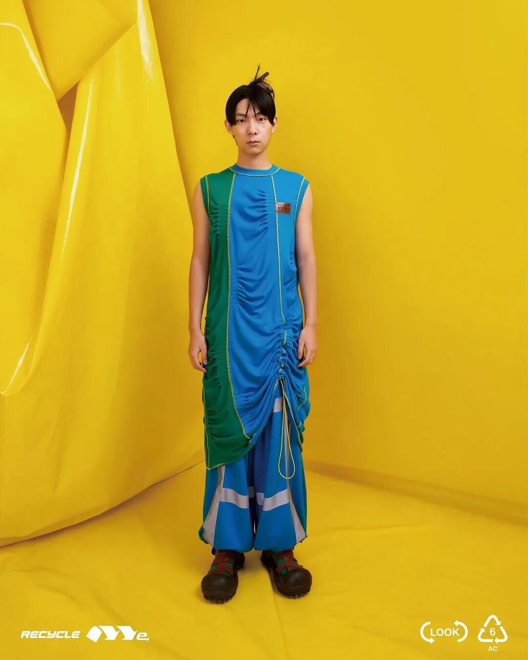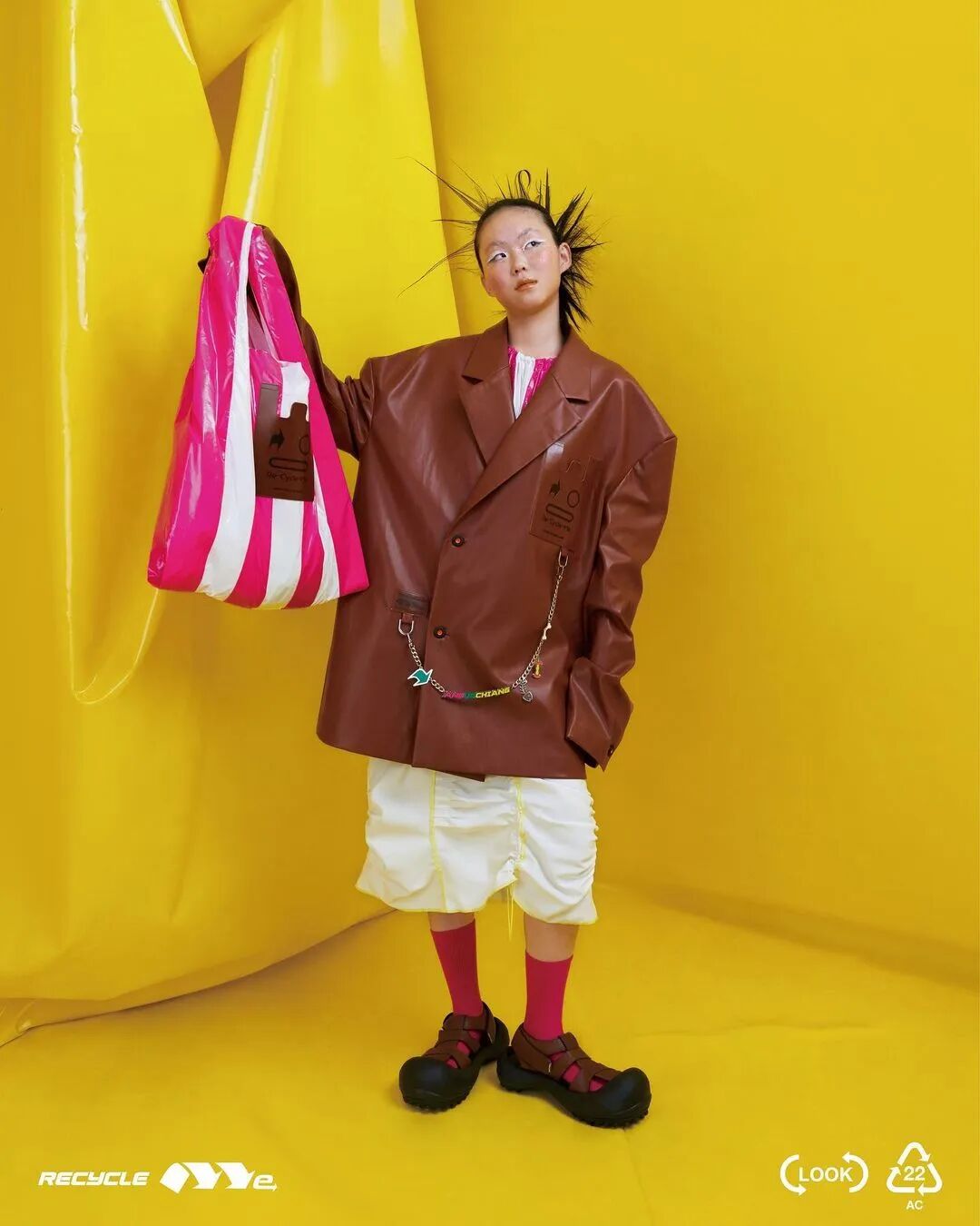 ANGUS CHIANG 2022 春夏系列“Re-Cycle-Me”,设计师以垃圾分类为灵感,将过往剩余面、辅料二次创意开发,取用垃圾袋外形的褶皱、庞大量感作为廓形,结合垃圾袋面料材质、图像、标语等细节,更将垃圾回收车之人员造型、色彩结合其中。