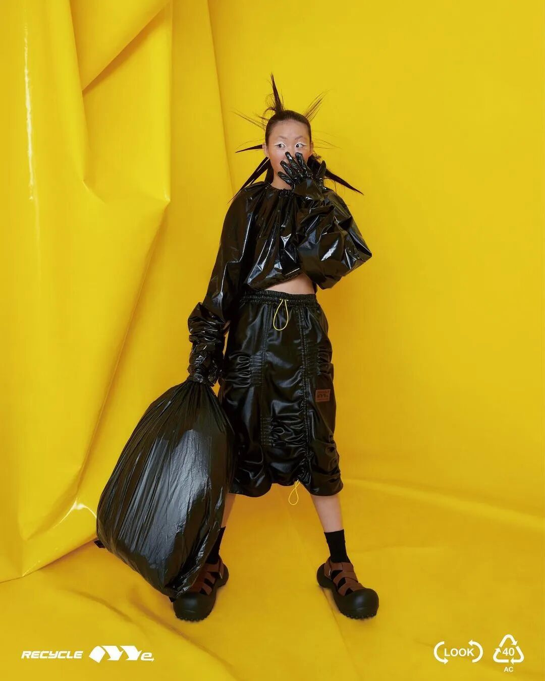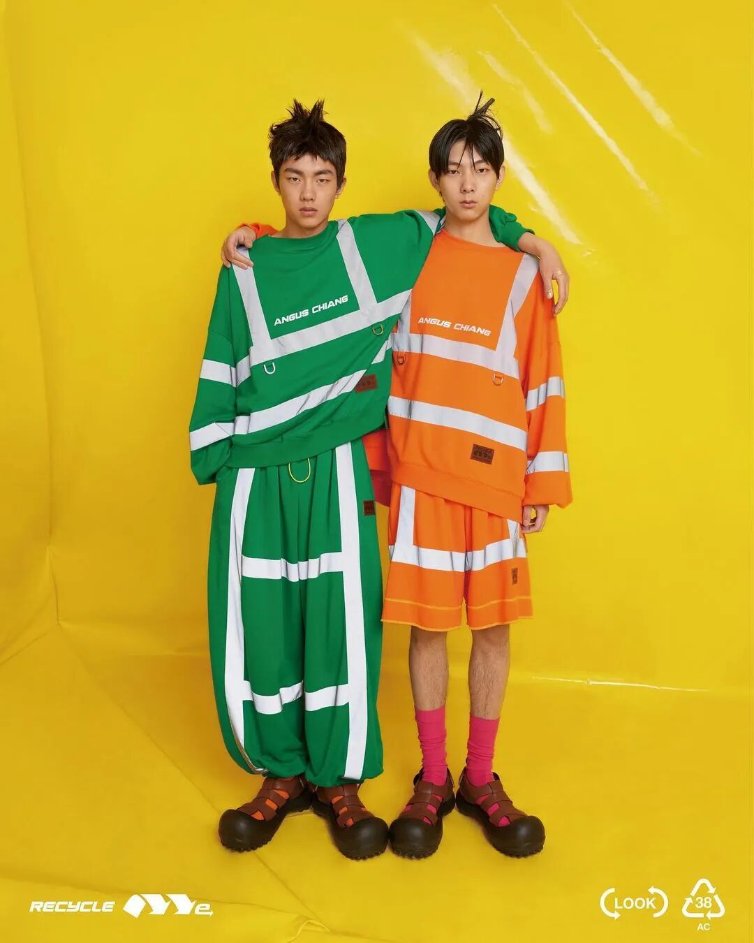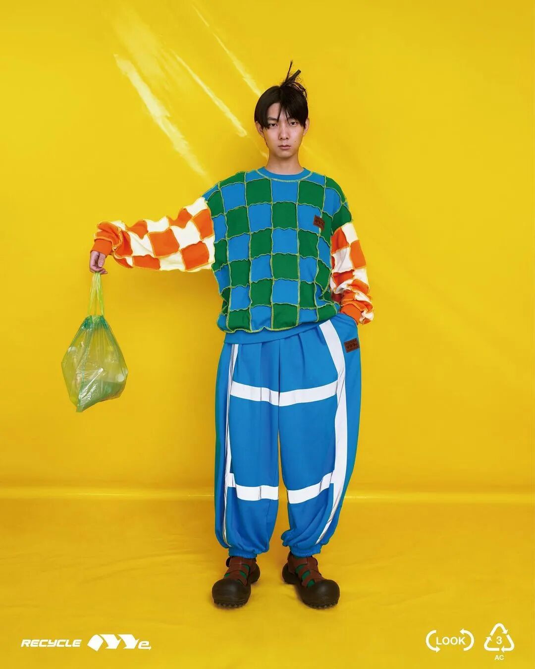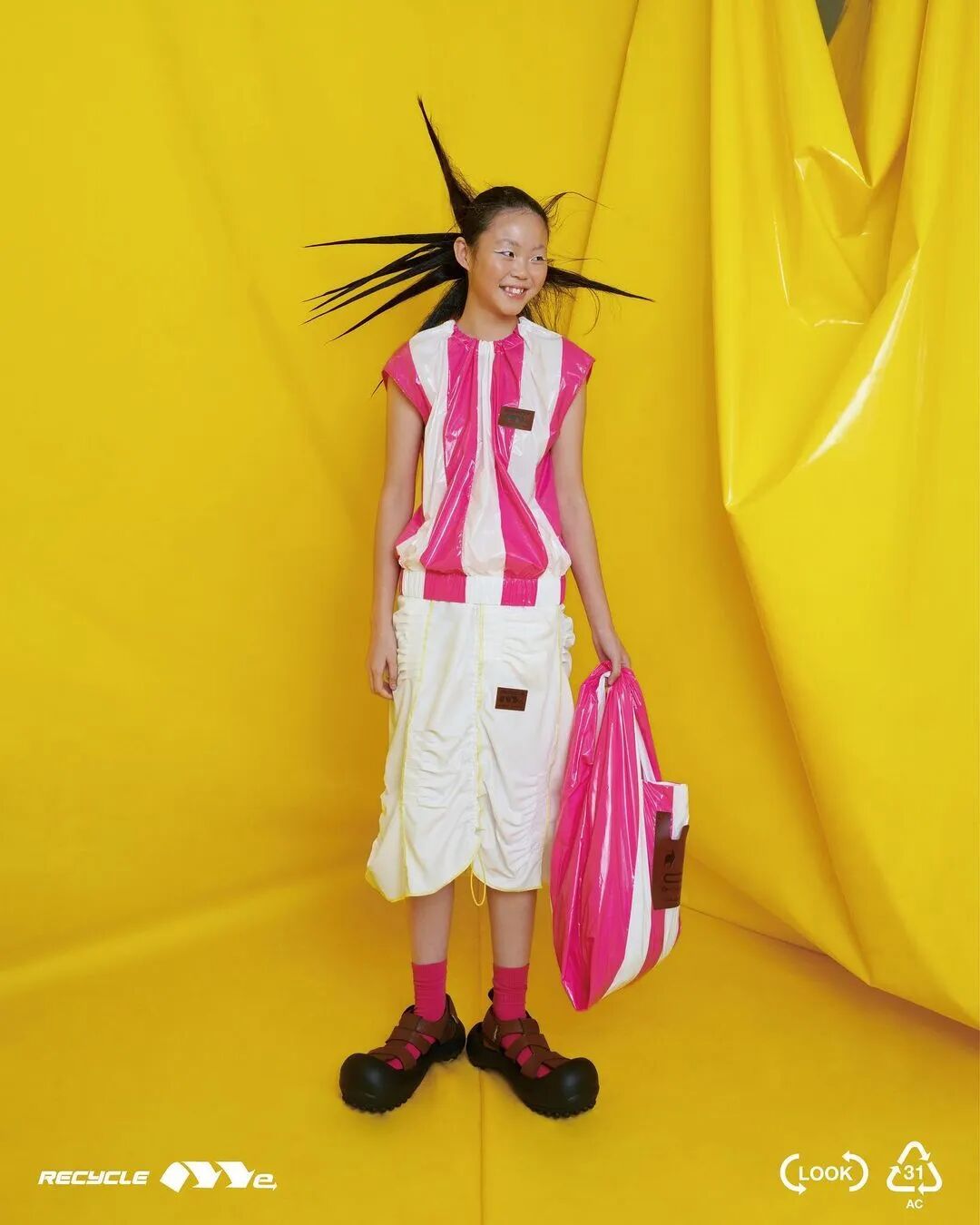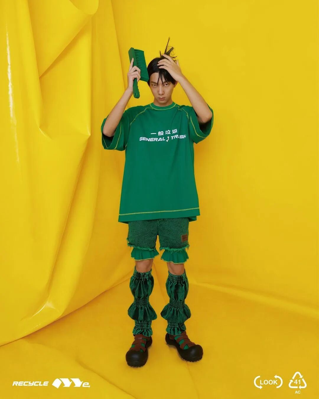 ANGUS CHIANG 2022 春夏系列“Re-Cycle-Me”,设计师以垃圾分类为灵感,将过往剩余面、辅料二次创意开发,取用垃圾袋外形的褶皱、庞大量感作为廓形,结合垃圾袋面料材质、图像、标语等细节,更将垃圾回收车之人员造型、色彩结合其中。