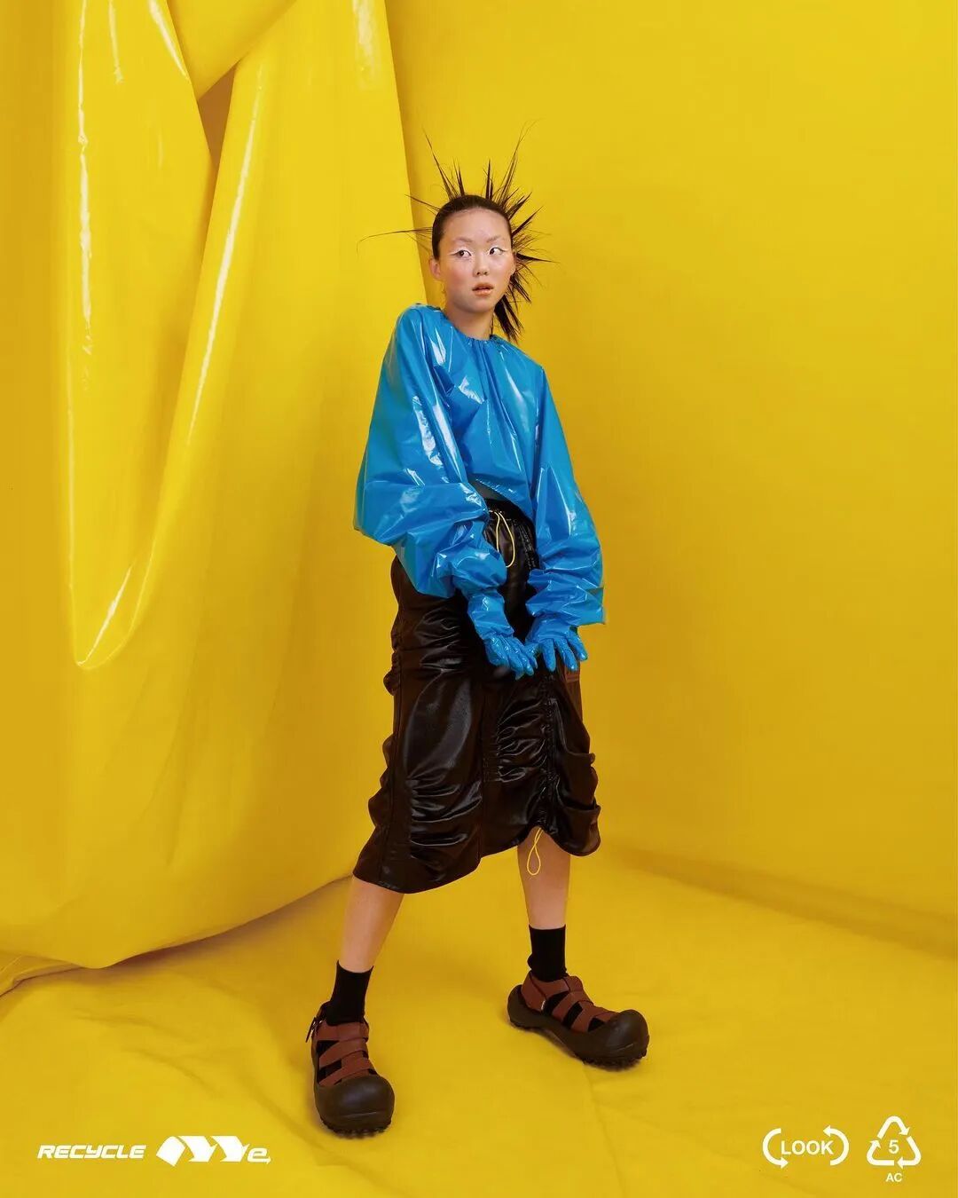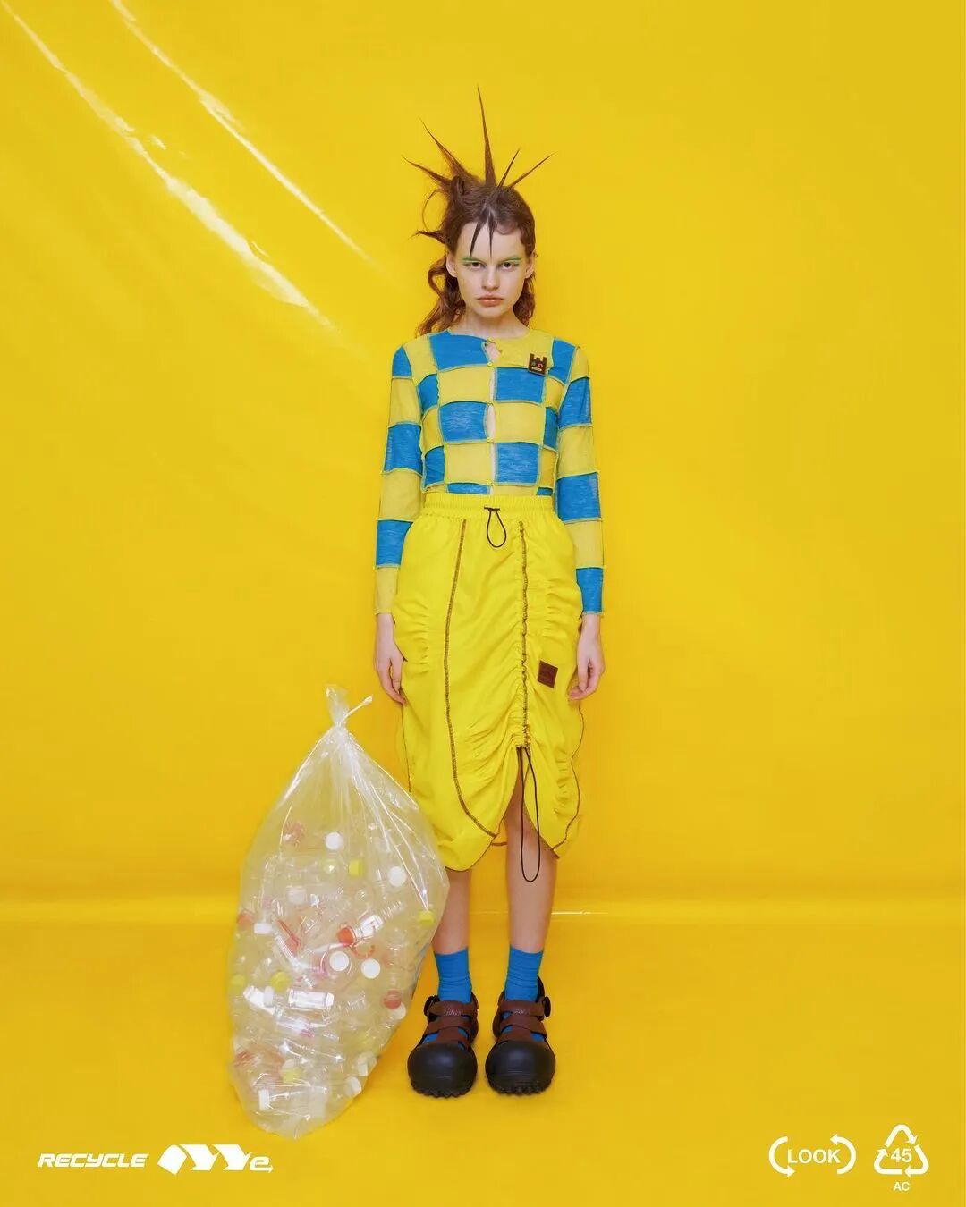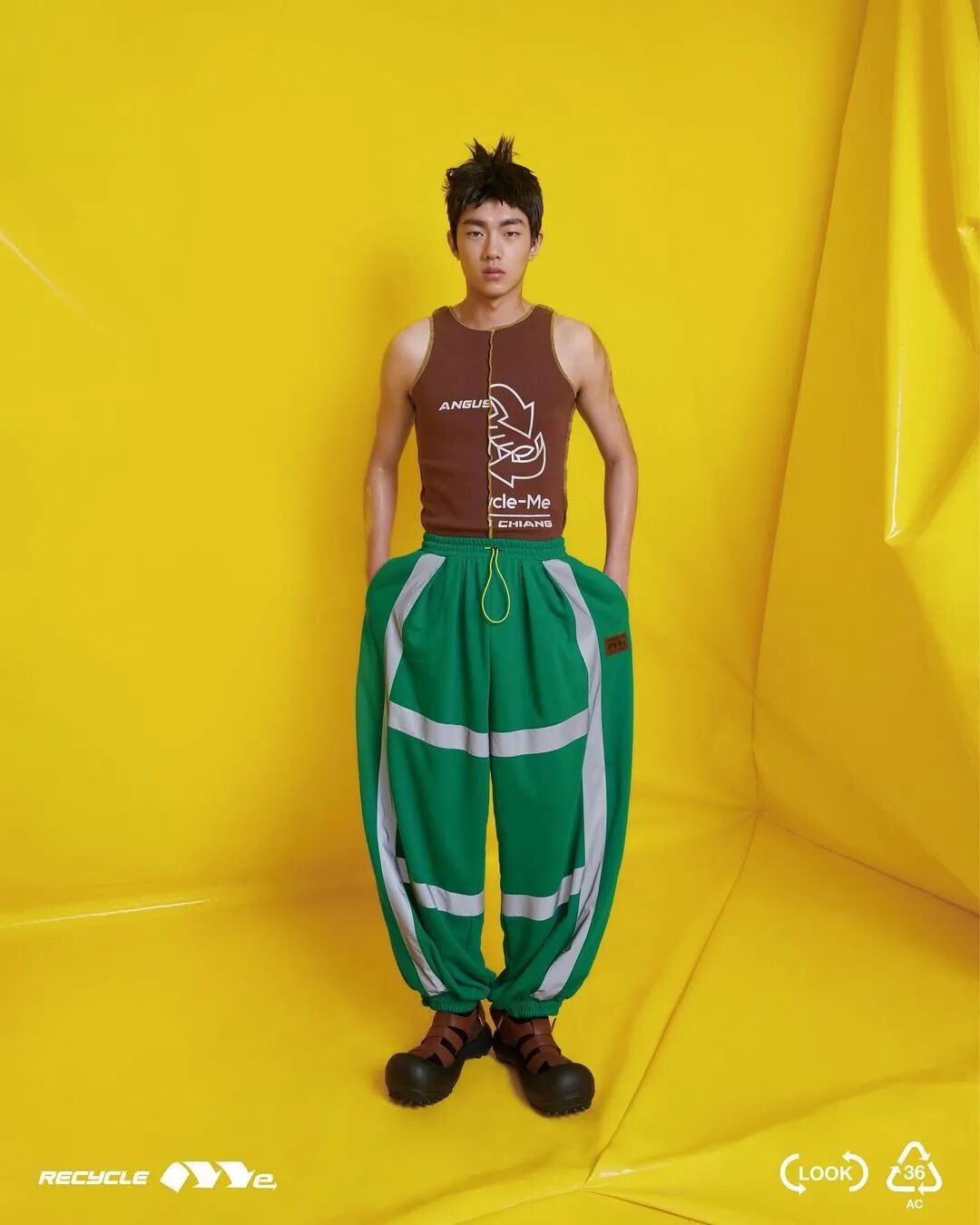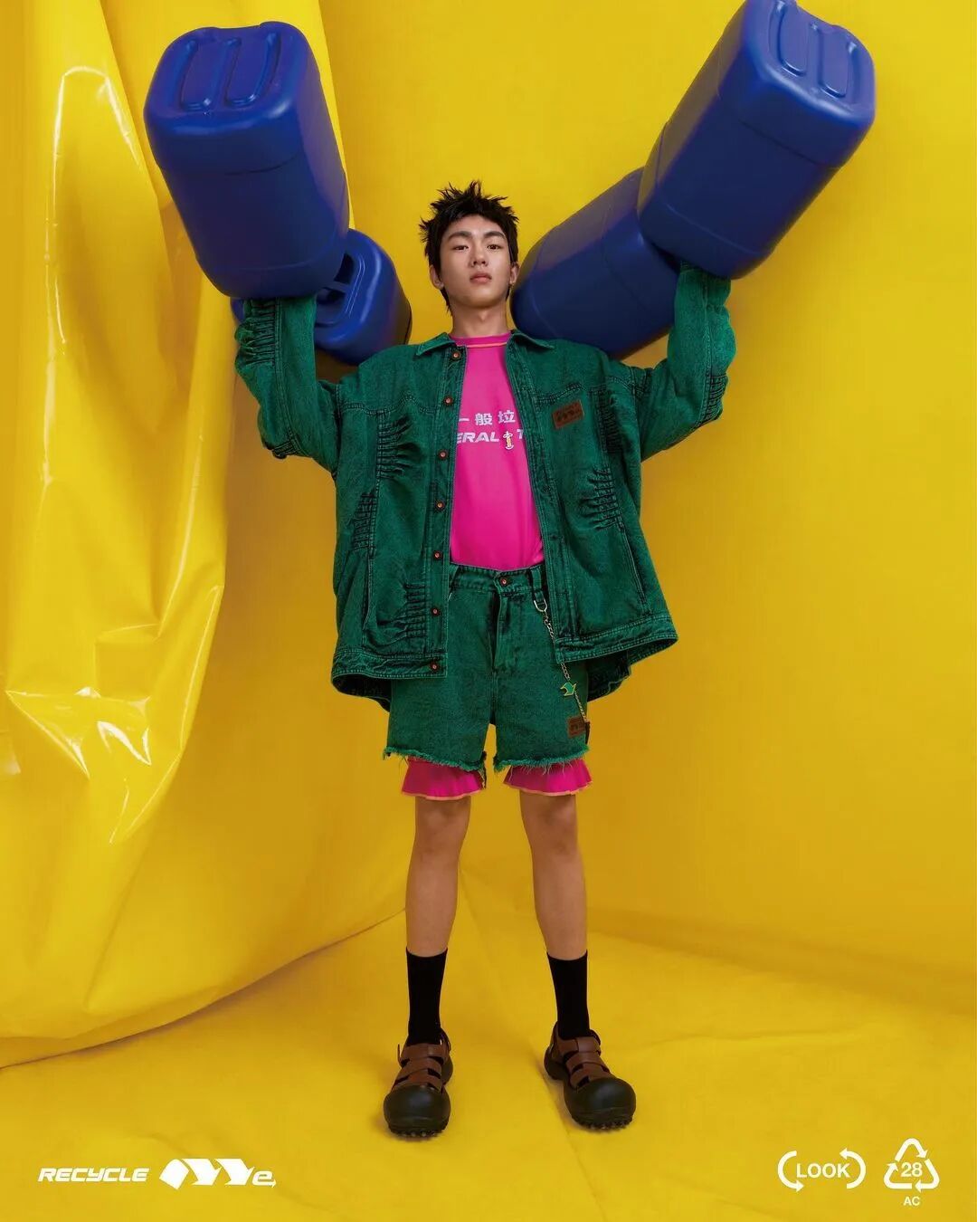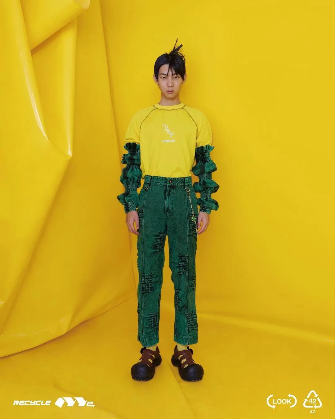 ANGUS CHIANG 2022 春夏系列“Re-Cycle-Me”,设计师以垃圾分类为灵感,将过往剩余面、辅料二次创意开发,取用垃圾袋外形的褶皱、庞大量感作为廓形,结合垃圾袋面料材质、图像、标语等细节,更将垃圾回收车之人员造型、色彩结合其中。