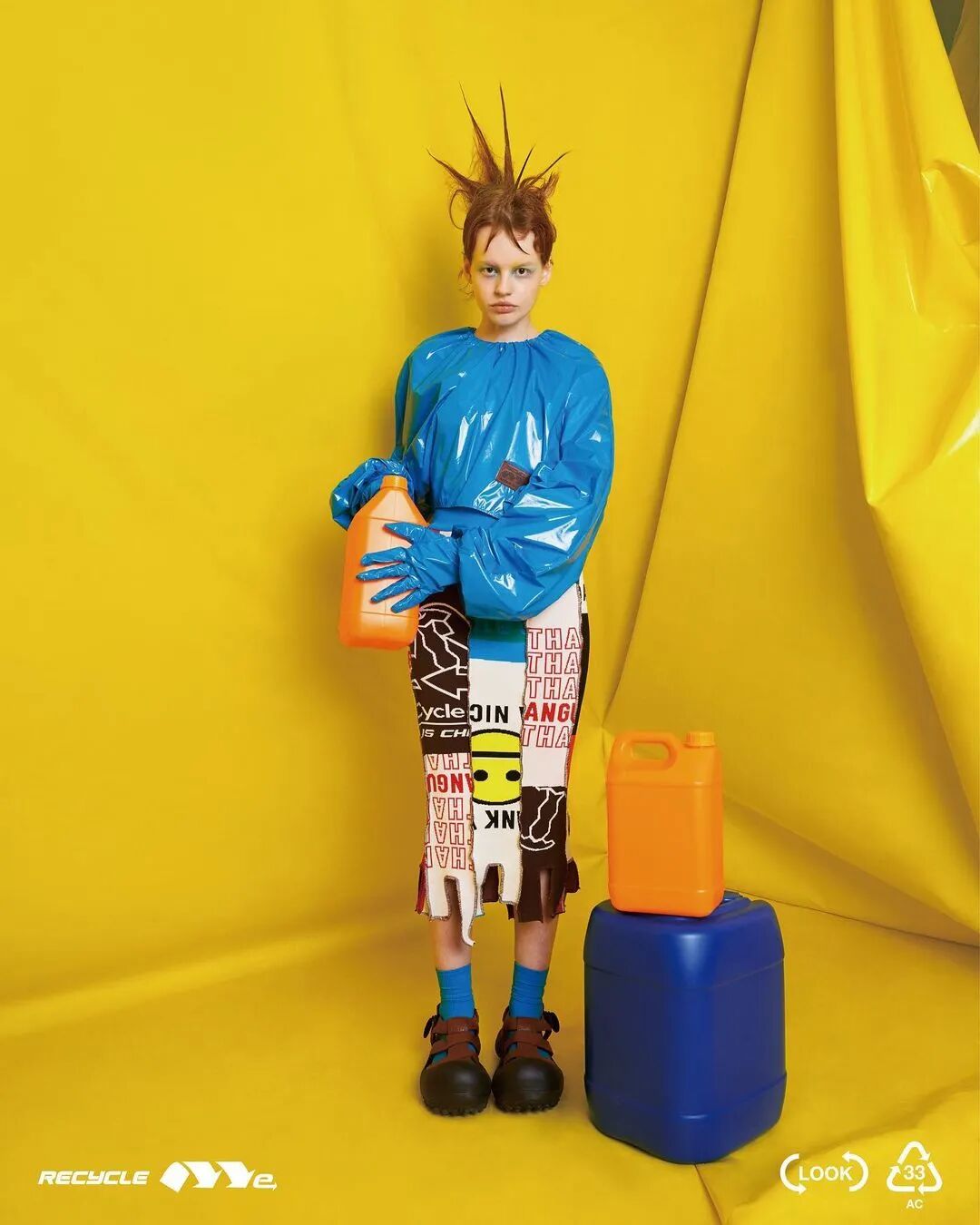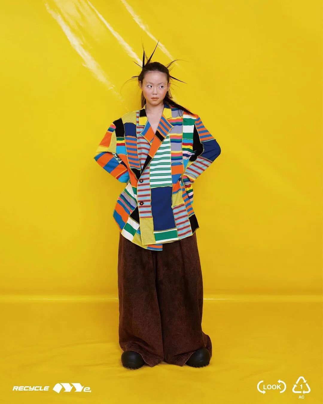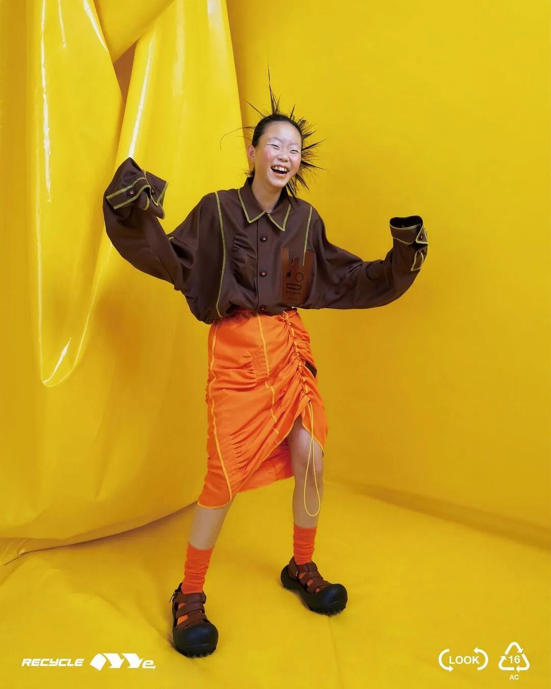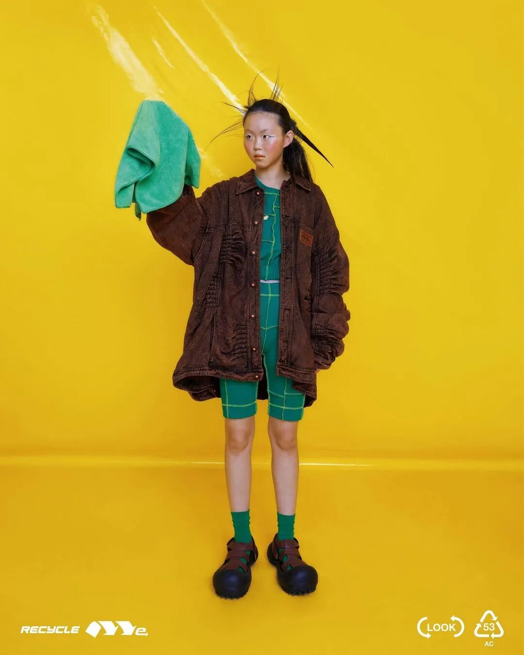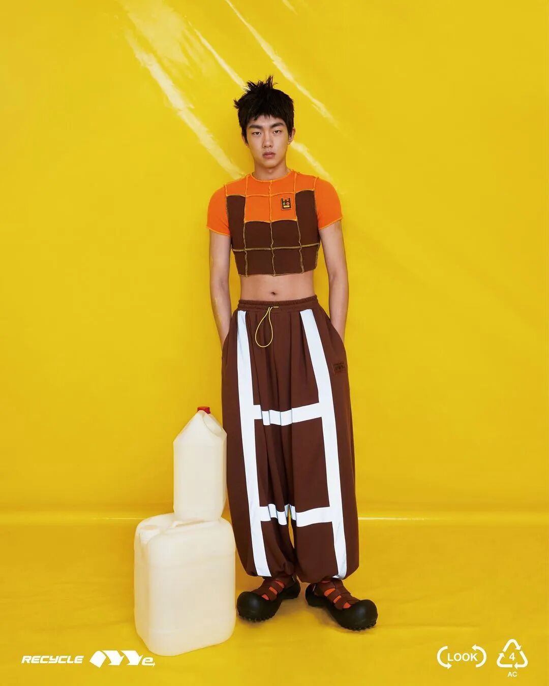 ANGUS CHIANG 2022 春夏系列“Re-Cycle-Me”,设计师以垃圾分类为灵感,将过往剩余面、辅料二次创意开发,取用垃圾袋外形的褶皱、庞大量感作为廓形,结合垃圾袋面料材质、图像、标语等细节,更将垃圾回收车之人员造型、色彩结合其中。