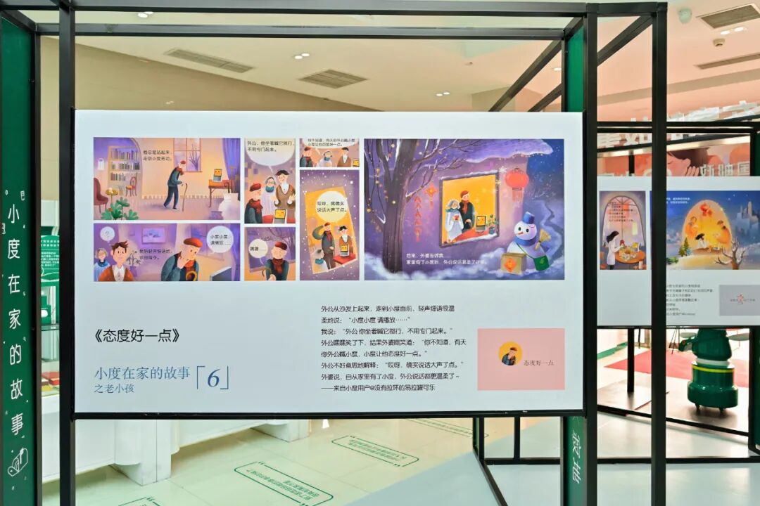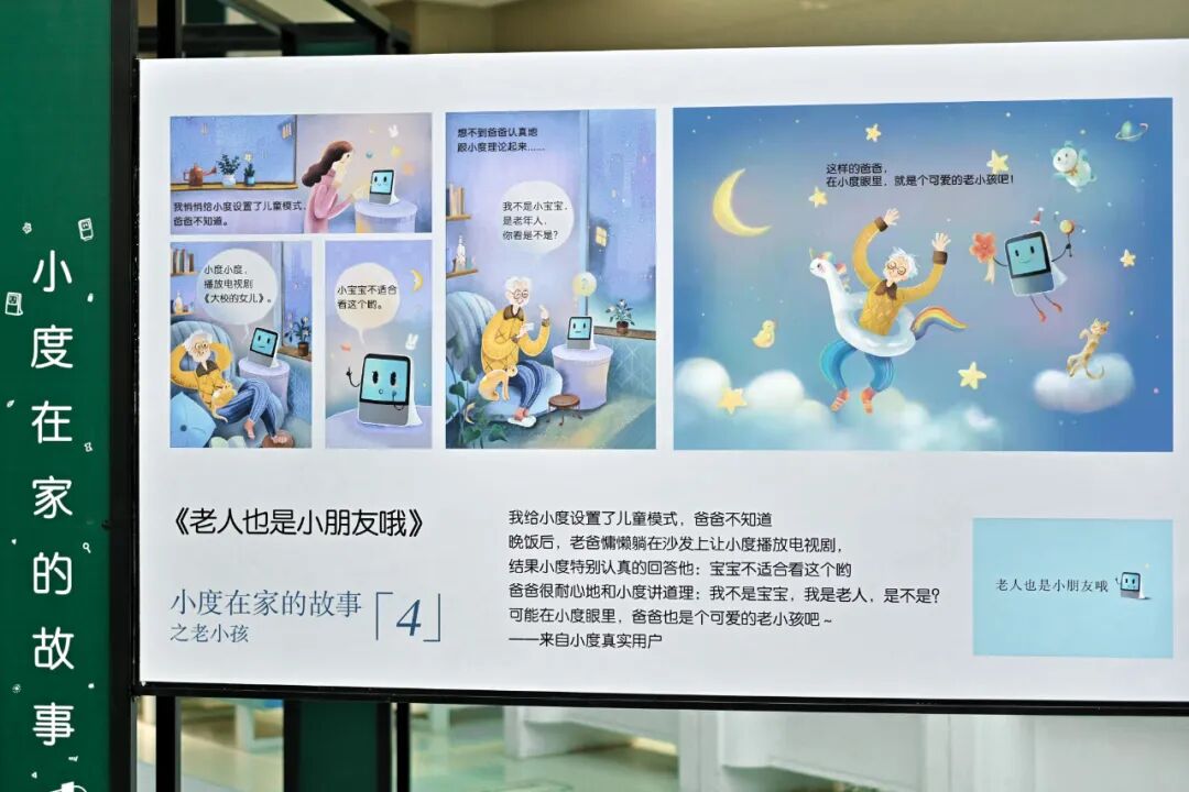 画展的每一副作品都由被誉为“情感色彩魔术师”的漫画家寂地,以小度用户真实分享的故事为蓝本进行创作,纪录下一幕幕长辈们面对小度时的“孩子气”瞬间和可爱举动。