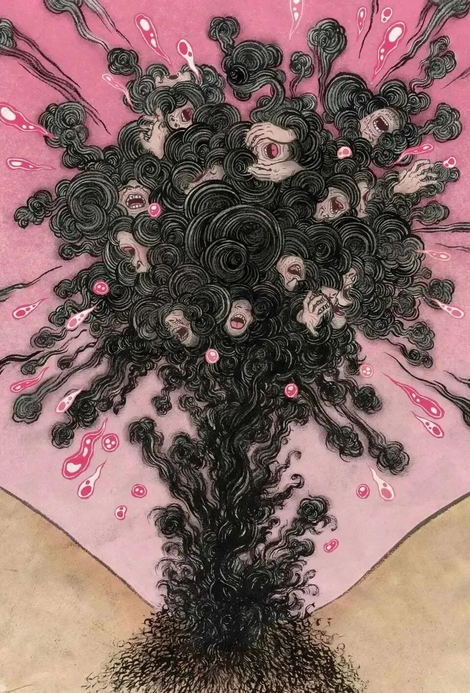 你抓耳挠腮看不懂她想表达什么,却能明显感知到画中的怪奇色彩,就像她自己形容的“有一点怪诞和梦幻”。