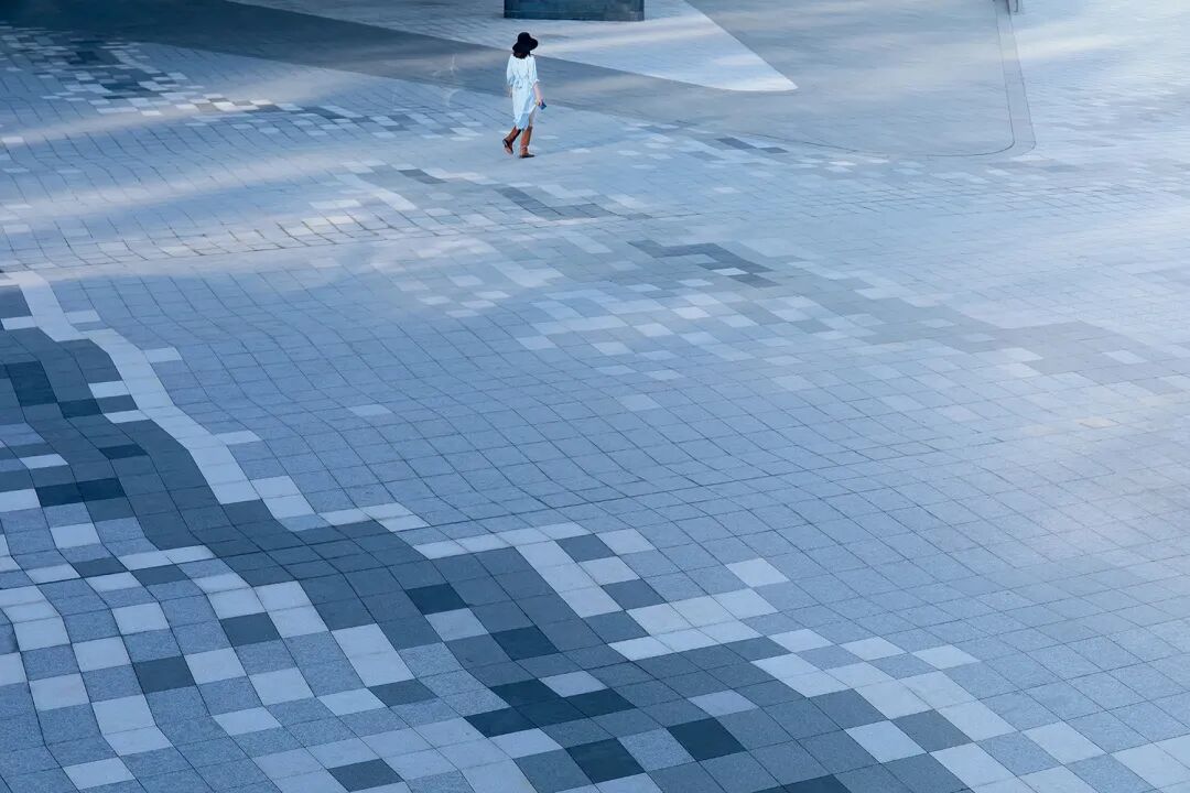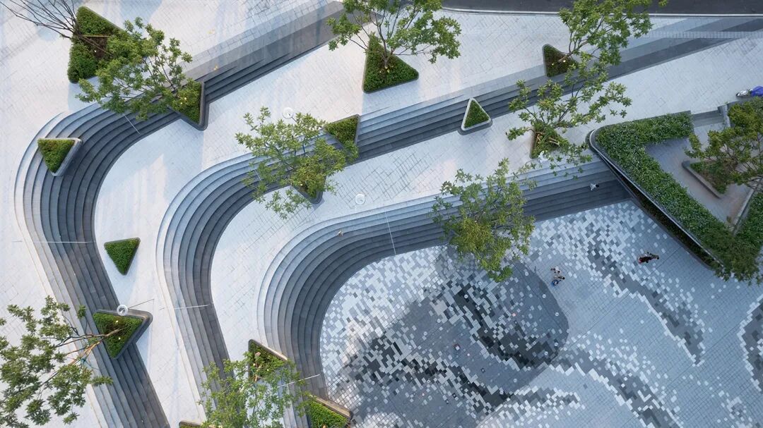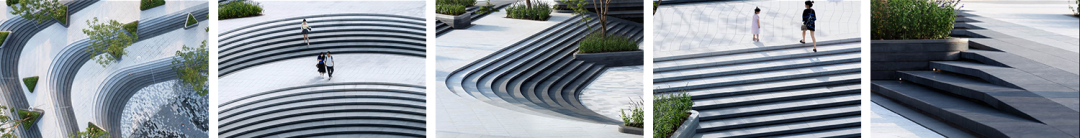 前广场台阶模拟海洋生态地形的有机曲线,台阶和铺地选择了天然的石材,颜色由潜至深随之发生变化,模拟海底的光影变化,仿佛引导着人们在一步步的探索下潜到“海洋”深处。铺装的设计方式则采用了矩形与平行四边形穿插搭配的方式,远远看去创造出一种海水折射的3D错视效果。这一系列尺度友好的空间组合和充满想象力的多维度空间叙事将城市中的人们吸引至此。大人们带着孩子们在这里玩耍和休憩。空间变为人与他人、与空间、与自然互动的场所。