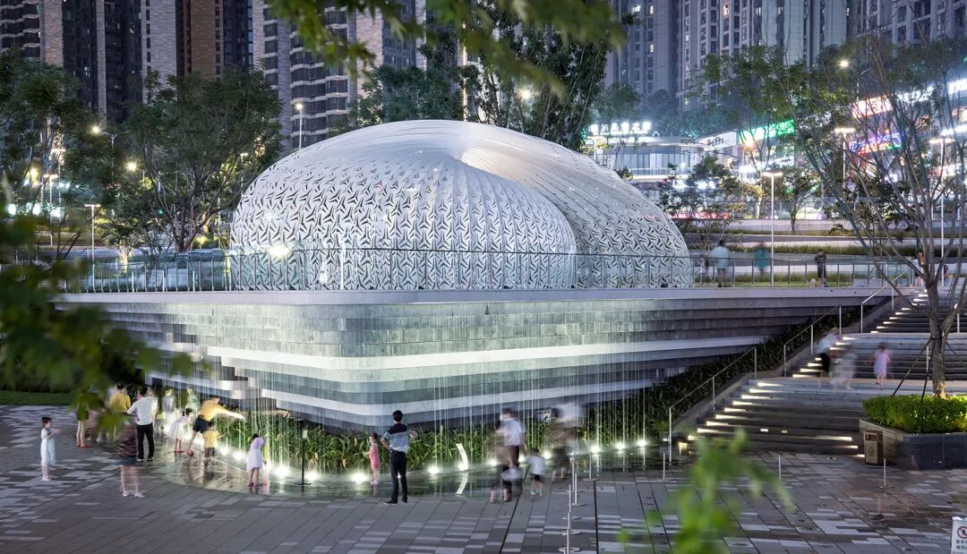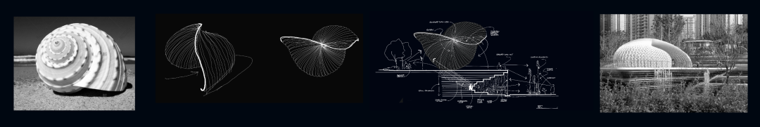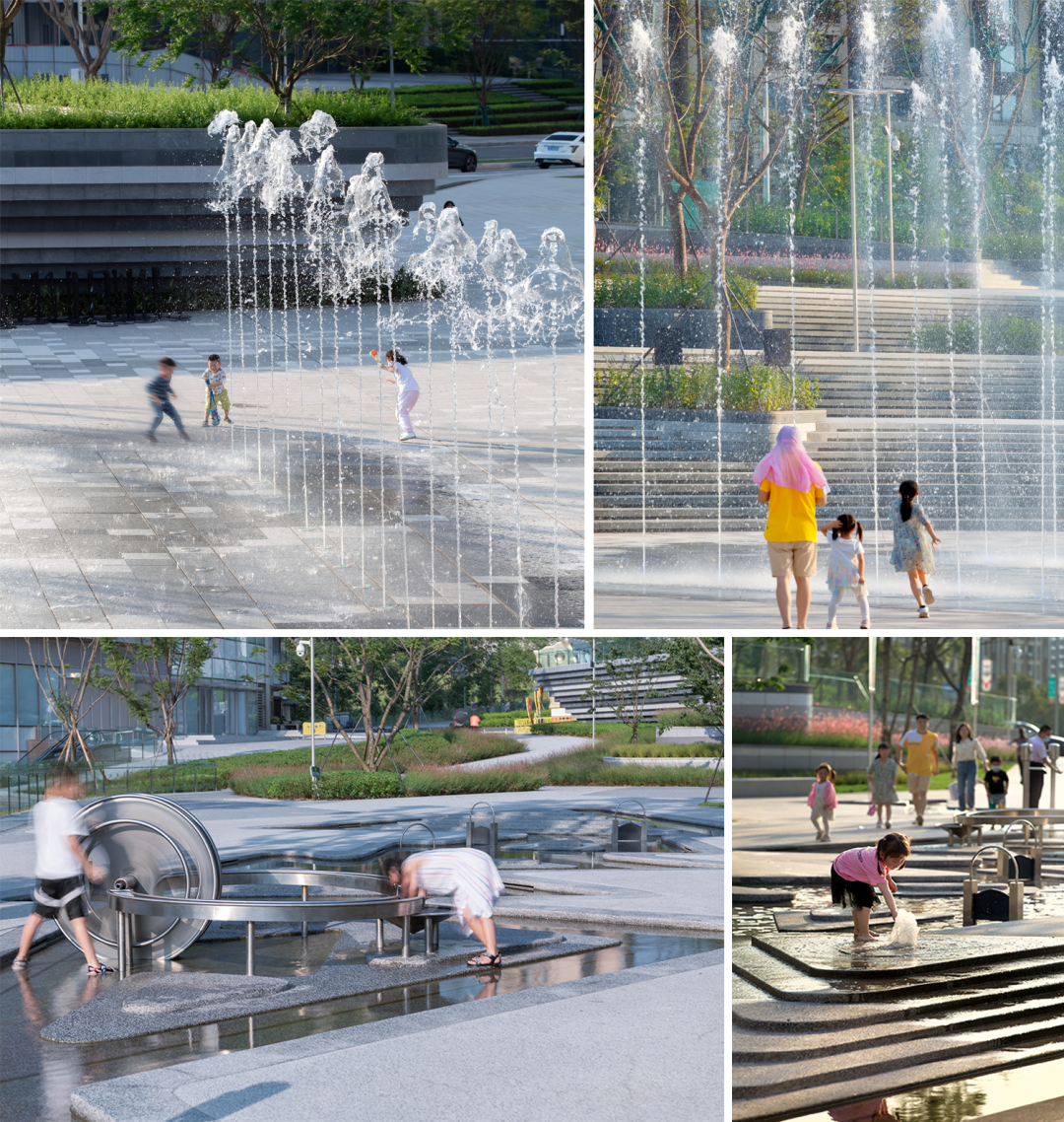 穿越层叠神秘的广场入口部分,继续向前探索,来到广场的“社交空间”,这是一个利用复杂地形高差打造的多层次社交空间,包含了中央景观眺望平台贝壳状互动雕塑多样化种植区、儿童玩水区、互动装置设计、高达20米的跃动喷泉等。这个场所作为需要承载超过5万人次的区域商业公共空间,满足日常休闲、聚会、节庆活动的功能,位于中心部分的是高于场地的景观平台以及上面的贝壳状雕塑。设计团队将场地复杂的地形转变为设计优势,通过景观平台和贝壳雕塑完美的串联了不同地势平面,模拟出海洋多层次空间。人们从贝壳入口进入探索,穿梭在不同的地形层次中。景观平台四周还设置了水帘,结合植物形成趣味空间,提供给孩子们在这里停留玩耍的机会,广场上的喷泉则在炎热的夏季也起到了降温的效果,从视觉、触觉、听觉等多样化感官上唤起了人们在海底探索的感觉。