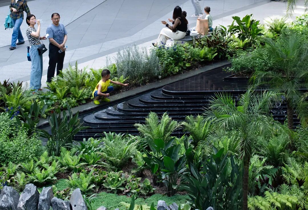 走过整个项目前广场,来到“内街”,内街以“热带峡谷”为灵感,结合场地和建筑本身的高差和起伏,景观的植入再现了奇幻神秘的热带地貌和植物特征。街道空间充满了丰富的植物群落,利用重庆特殊的气候条件,设置了部分大叶热带植物。内街中央设置以社交为导向的多层次空间节点,使用天然真实的石头,配合热带植物力求打造真实的热带雨林感受,水景部分还设置喷雾,炎热的夏季也能起到降温作用,从视觉,触觉,多维度为人们打造神秘,舒适的空间,人们可以在露天咖啡馆和餐厅享受他们的时光,仿佛置身真实的热带雨林。