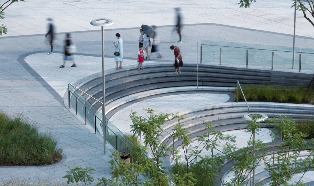 From the urban park visitors travel to the community plaza, an event and gathering space framed on either side by elevated lookouts and sculptural art works and enclosed by terrace seating. The interactive sculptural artwork mimics the form of a seashell, allowing visitors to explore as they traverse a cave-like space to reach the lower level and take in the delightful view of a 20-metre-high dancing fountain. As a major gathering community events space, the urban arrival park serve for having local community of over 50,000 residents a place meet and celebrate holidays and festive events. The northern edge of the plaza contains a lookout space which floats out of the terrace, allowing people to explore the planting which acts as a refuge in the shade of the trees.