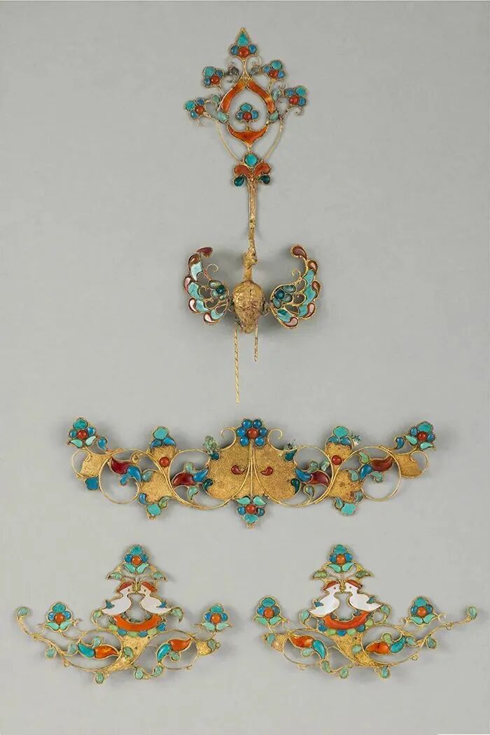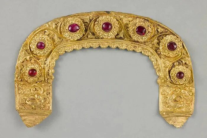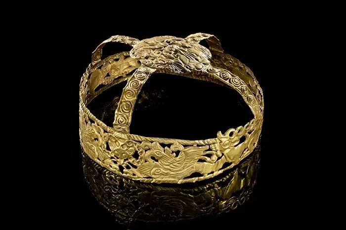 展览共分为三个部分。第一部分展示公元前18世纪中国与欧亚草原地区的早期金器,探讨草原与中原地区的互动交流,展出珍品包括匈奴贵族所使用的金冠。第二部分聚焦公元7至10世纪期间唐朝与吐蕃王朝的金器,展示金器在两个王朝密切交流中扮演的角色。展品包括吐蕃贵族所使用、带中原纹饰的幡饰,以及唐代公主所配戴工艺上借鉴中西亚饰物的嵌宝冠饰。这些互动交流是古代丝绸之路活动的重要组成部分。第三部分呈现古代中国金器制作辉煌时期的成就,展示辽宋至明代黄金制品呈现的本土化和民族交融特色。