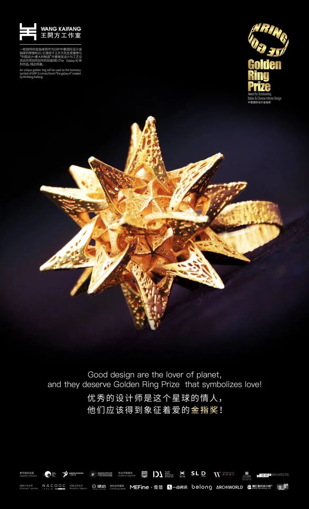 一枚独特的金指环将作为GRP中意国际设计金指奖的荣誉标识,授予那些脱颖而出的优秀设计师们,它的设计源自中国最具跨学科思考实践和影响力的当代艺术家、建筑师、设计师王开方先生所创作的《 K 星球 》(The Galaxy-K)系列作品。当晚,我们有幸邀请到王开方先生出席现场揭开金指环的真正的奥秘,并诠释金指环的真正涵义,同时给予在场来自中意两国的设计师们最美好的祝愿!