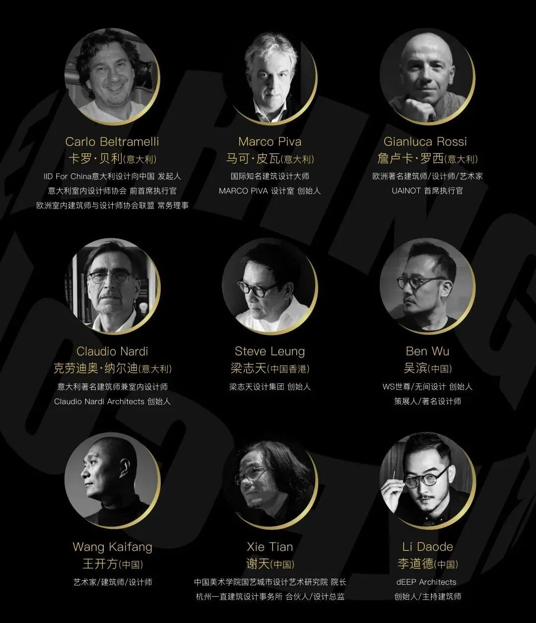 届时2021GRP中意国际设计金指奖的评审委员会成员Carlo Beltramelli、Marco Piva、Gianluca Rossi、Claudio Nardi、梁志天、吴滨、王开方、谢天、李道德 等多位权威领袖将共贺这场中意设计文化交流的国际盛事,给予参评设计师宝贵的建议以及分享在评选过程中的趣事,同时见证来自中意两国的获奖设计师的荣耀时刻!