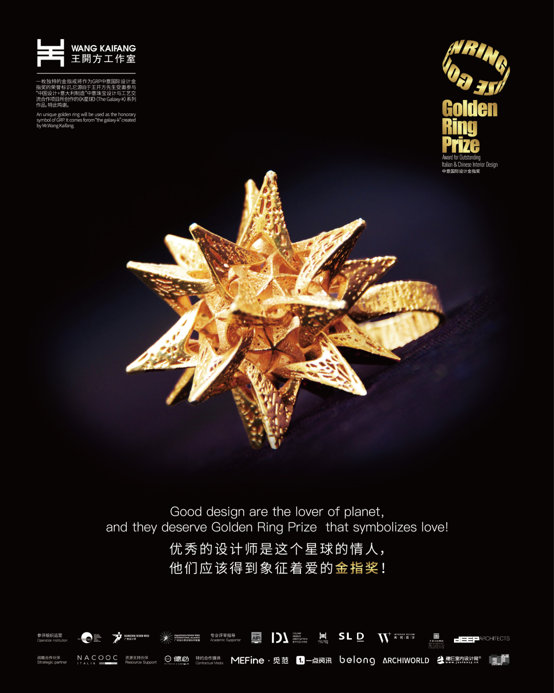 一枚独特的金指环将作为GRP中意国际设计金指奖的荣誉标识,授予那些脱颖而出的优秀设计师们,它的设计源自中国最具跨学科思考实践和影响力的当代艺术家、建筑师、设计师王开方先生所创作的《 K 星球 》(The Galaxy-K)系列作品。