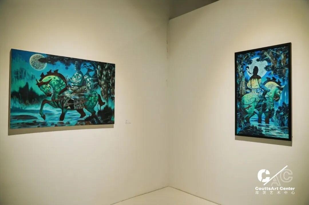 本次个展,展出了徐松波近年来创作的35幅关于马和“唐风”的作品,“唐风” 系列是他最近开始的一个新的主题创作,骏马、猎犬、华服、强弩是艺术家日常构建古典与理想使用的符号。其中《大唐风华-青夏02》是他用古典青绿色调进行大体量人物创作的尝试,衣着华美的唐代人物和姿态矫健的骏马,重建独属唐代的精神气质。“唐马”形象是个体、也是族群内心和精神的投影。展览将持续至2022年9月21日。