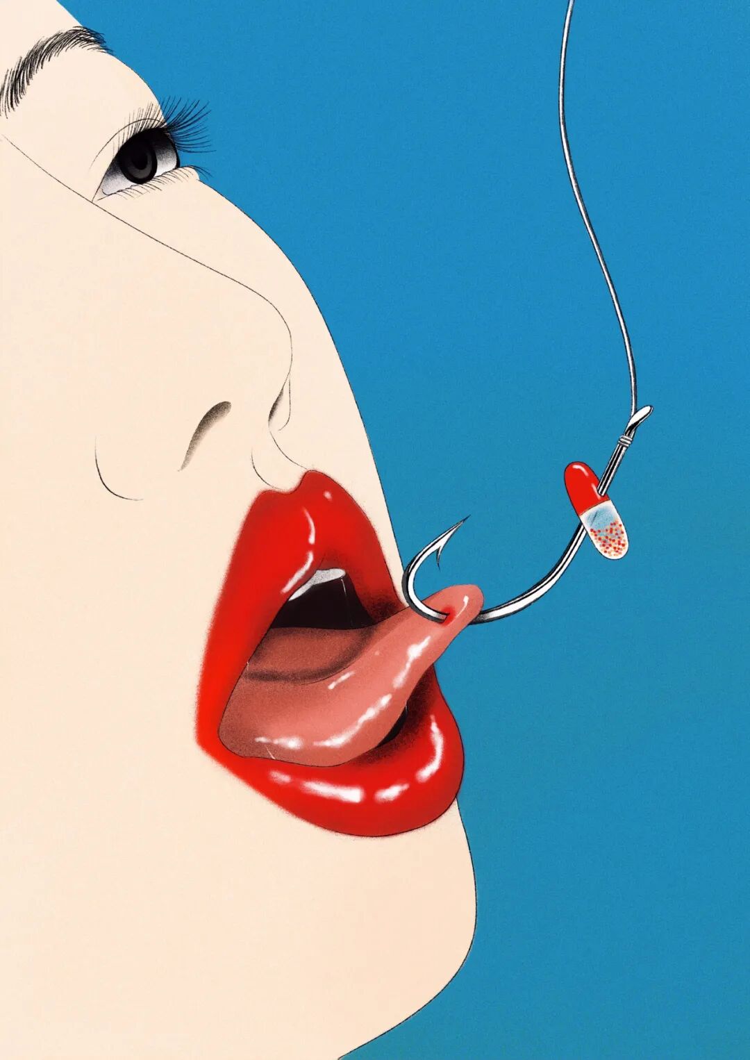 这些,也统统被Miki Kim洞察,然后画进了插画里,这些画中的人物或是被耳机侵蚀、或是被药丸占据:
