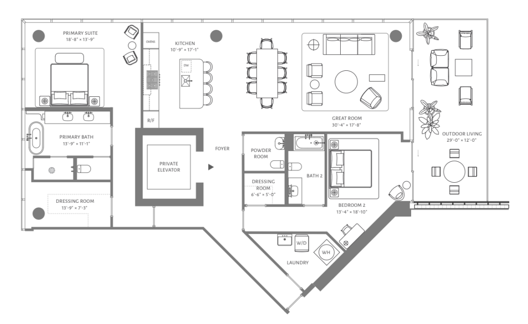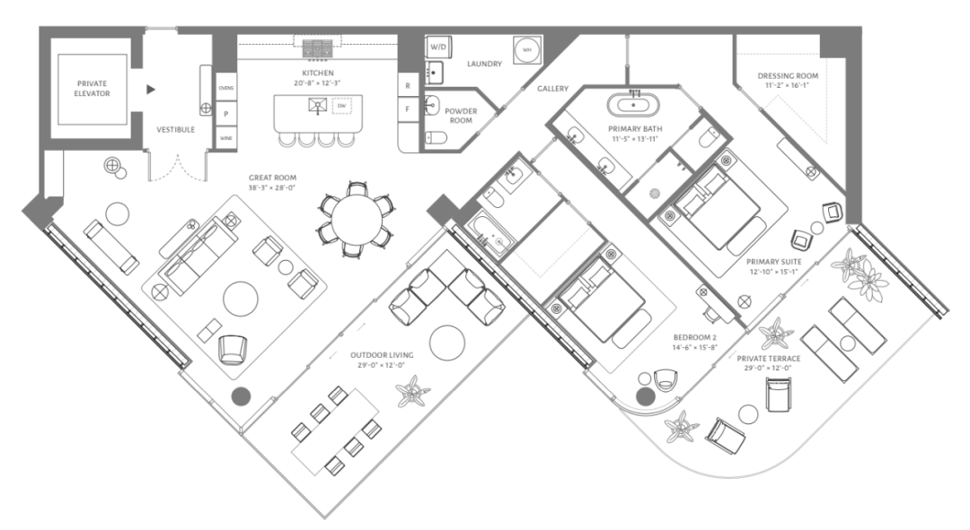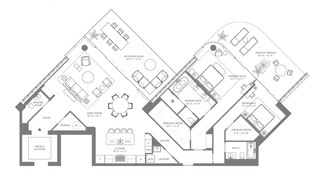 住宅楼内共有 83 套公寓,包含 9 套豪华套房,2 套复式公寓和 1 套顶层复式,布局从 2 居室到 4 居室都有,面积为 195㎡~670㎡。售价为 415 万美元(约 2938 万人民币)起。