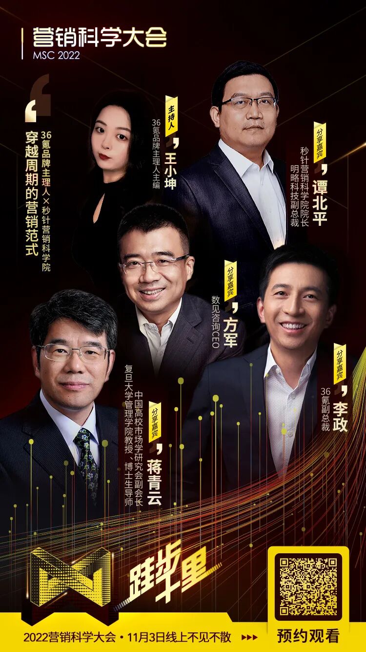 走起来,是尝试寻找本质,探索恒常之道。秒针营销科学院联合36氪品牌主理人推出“穿越周期的营销范式”圆桌,由36氪品牌主理人主编王小坤任主持人,数见咨询CEO方军,复旦大学管理学院教授、博士生导师,中国高校市场学研究会副会长蒋青云,36氪副总裁李政,明略科技副总裁、秒针营销科学院院长谭北平等来自各领域的营销科学家代表齐聚,共论品牌穿越周期所面对的困难和行动,并输出观察及建议,为企业发展提供科学参考。