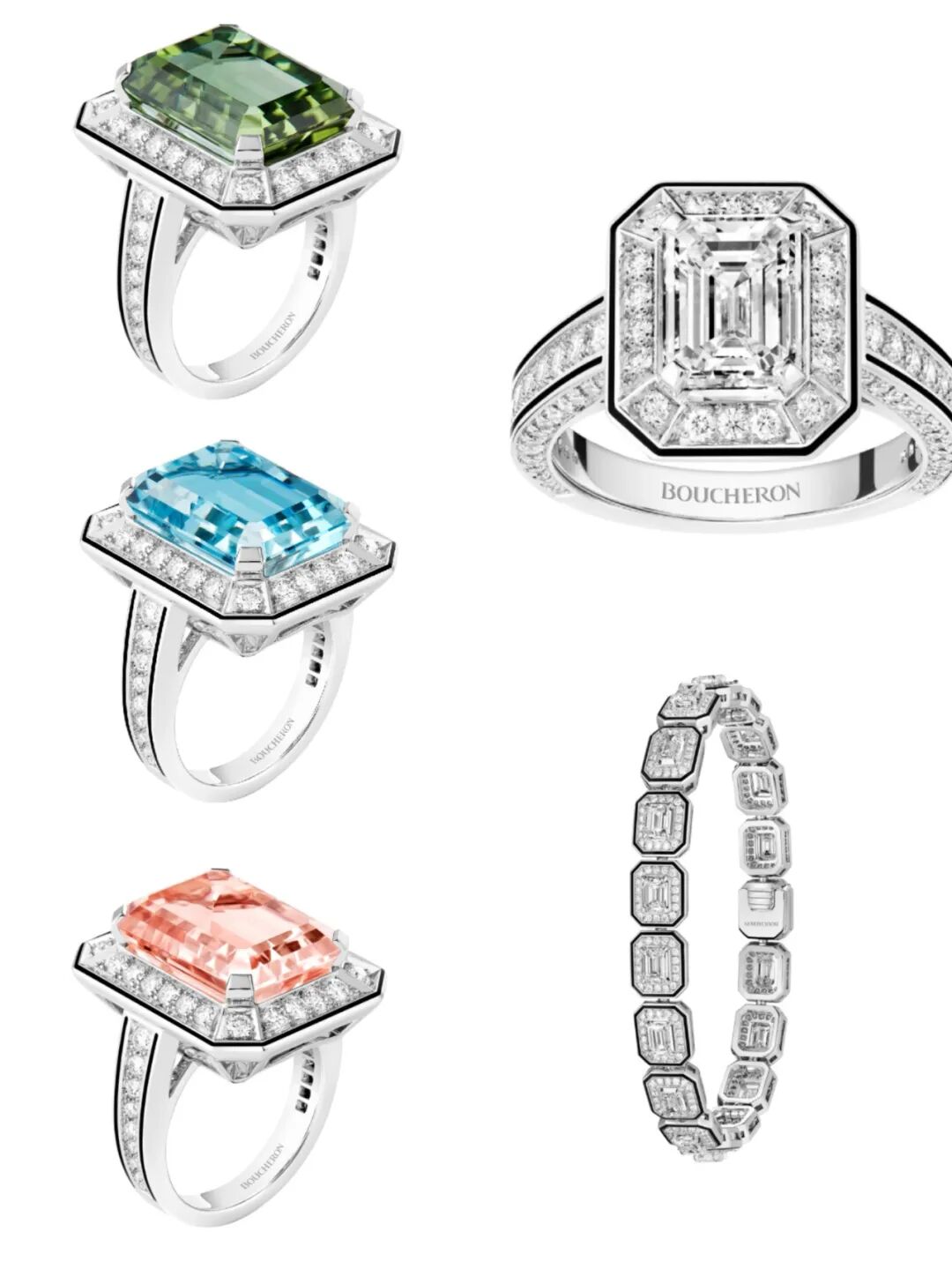 宝诗龙Boucheron推出的Vendôme Liseré系列作品,设计师灵感正是来自于巴黎旺多姆广场。其亮点是运用了色调明亮清澈的海蓝宝石、摩根石、绿碧玺为主石,通过祖母绿形切割突出广场俯瞰视角下的八角形轮廓。海蓝宝石呈现出海水般清澈的浅蓝色调,摩根石的色调柔美而温暖,绿碧玺则营造出自然生机。主石外圈勾勒圆钻镶边与黑色漆线,突出犀利的几何美感。