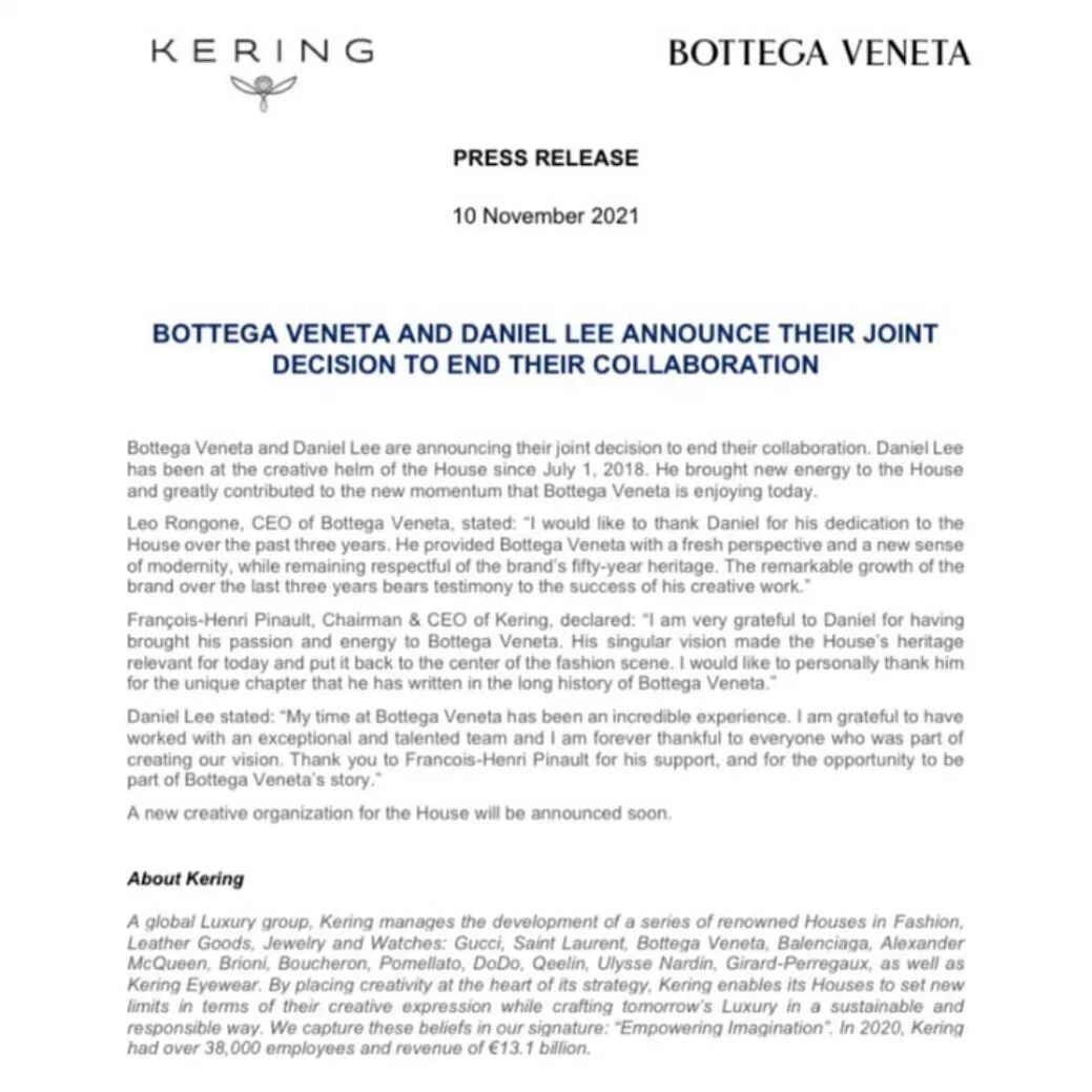 Bottega Veneta 首席执行官 Leo Rongone 并未在声明中透露 Daniel Lee 离职的具体原因,但表示 Daniel Lee 为品牌提供了全新的视角和新的现代感,过去三年 Bottega Veneta 的显着增长证明他的工作取得了成功,品牌将很快宣布他的继任者。