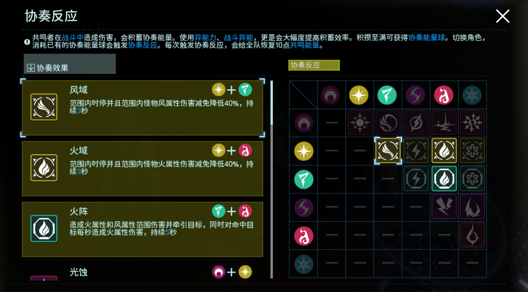 同时,《鸣潮》中的不同角色也各自拥有属性,这些不同属性的角色编队后,会两两触发协奏反应,并根据具体属性附加不同的效果。如果说「弹刀」机制拔高了单角色的纵向操作上限的话,那么QTE和协奏反应则通过不同角色的搭配,给予玩家横向的多样化游戏体验。包括不同机制的角色搭配也能在探索开放世界时,展现更多探索手段。