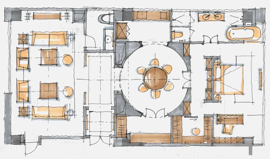 2、整体流程:方案手绘稿 → 手稿转化cad图纸/模型/效果图。如下图: