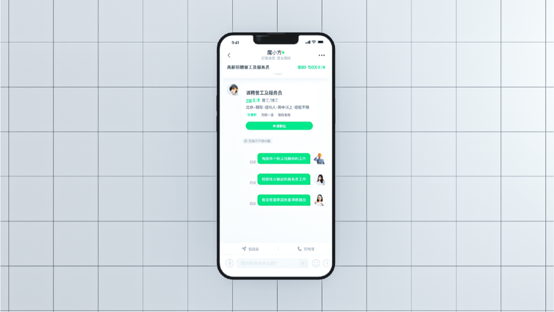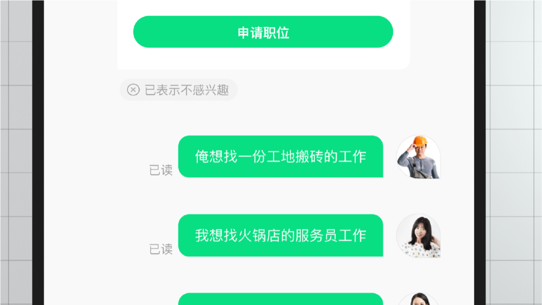 从赶集直招线上的招聘属性出发,挖掘用户的求职诉求,在找工作的聊天对话框中提炼出赶集用户的求职意向,通过赶集用户的求职意向职位,提炼出高频次的职位标签,将不同的求职标签icon又重新融入到赶集UP度沟通符号之中。