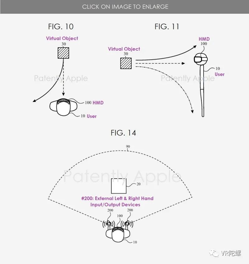 苹果公司的专利图10及图11说明了用户使用中的头戴式设备的俯视图以及头戴式设备所显示的虚拟物体的轨迹。