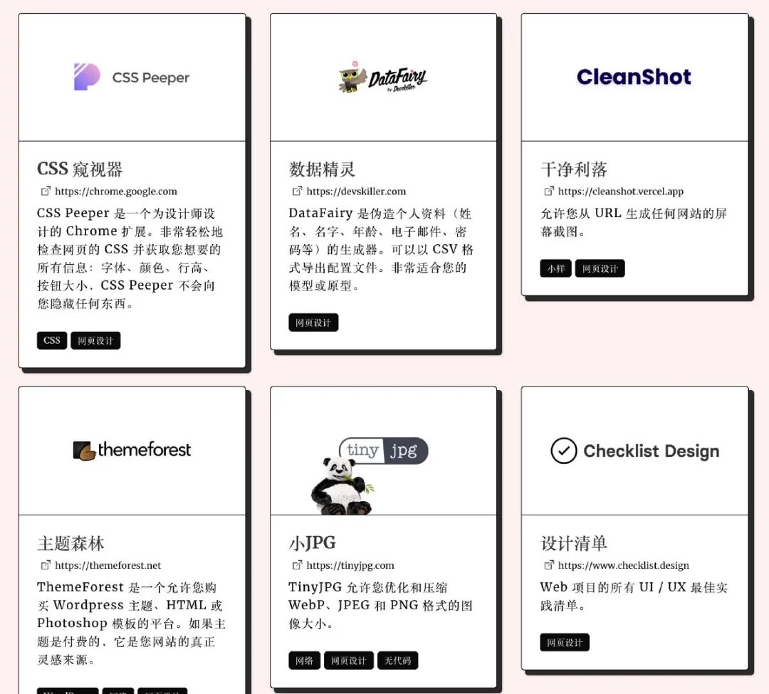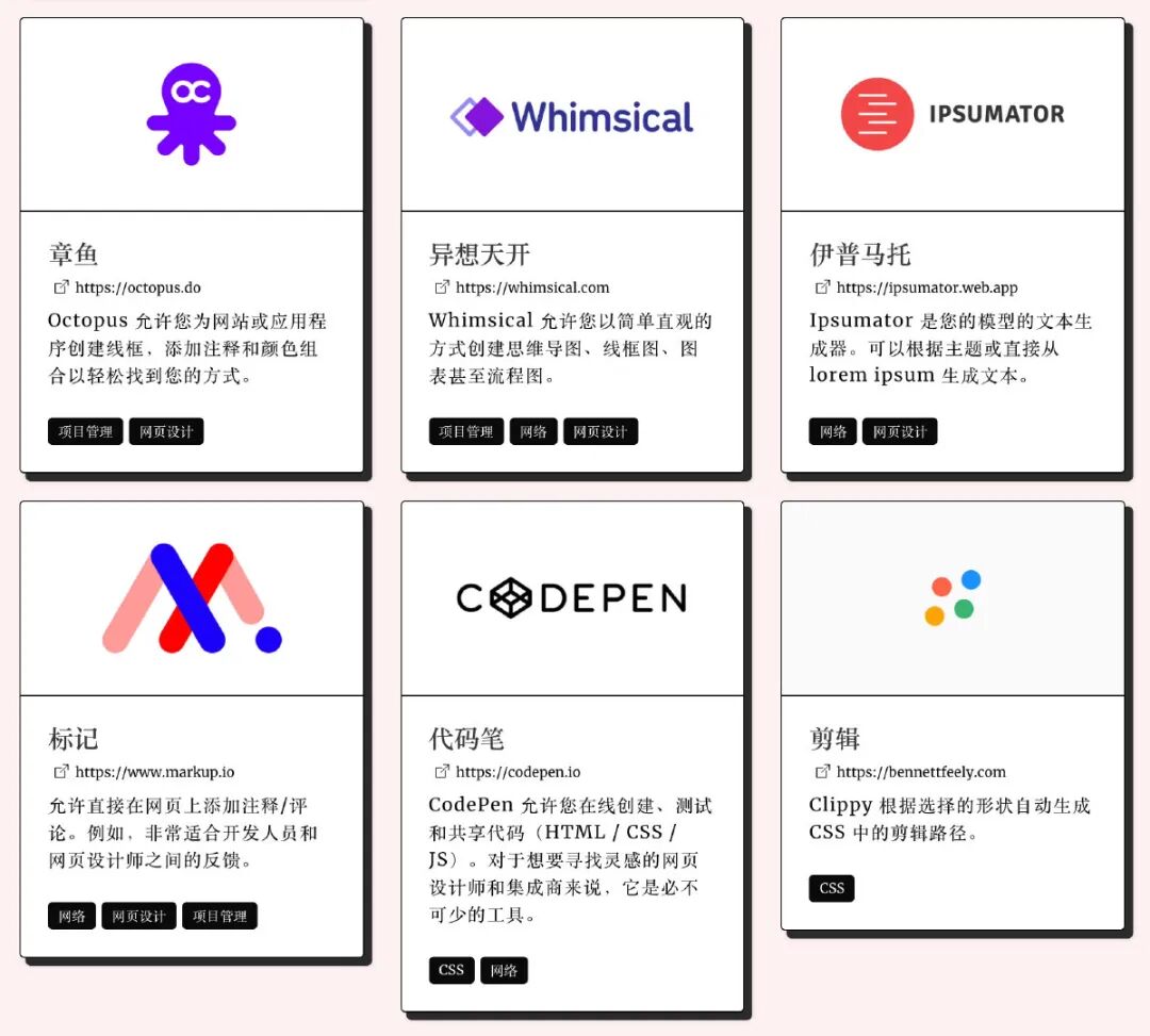 这是一个超实用的设计类工具大合集,主要面对设计师和产品,其中包含超过 100 款高质量的设计工具,覆盖了各式各样的设计场景和需求,比如有项目管理工具、代码优化工具、图片图标工具等,每周都会有更新