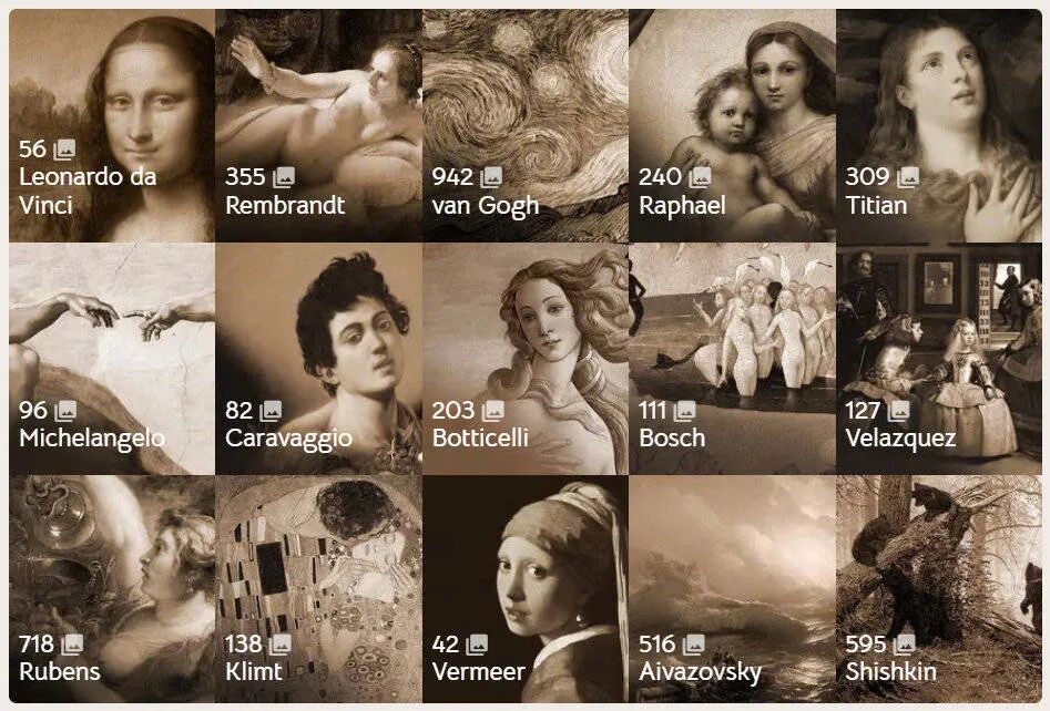 冕费世界名画高清图片!收录超过 170,000 幅艺术作品、10,000 个艺术家~ 梵高、莫奈、毕加索等传奇画作都能在线看,皆为高画质、高分辨率大图。开启图片集后会看到以艺术家名称命名的文件夹,注明了图片数量和年份。画作的详细页面会有艺术家、年代、收藏博物馆等信息