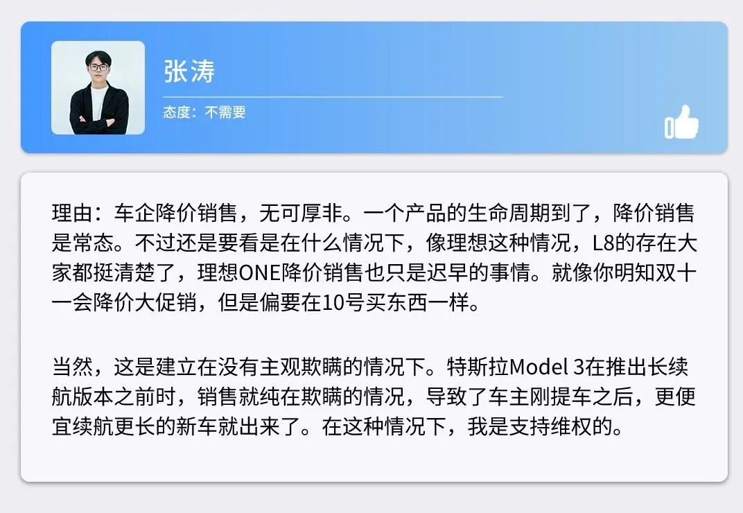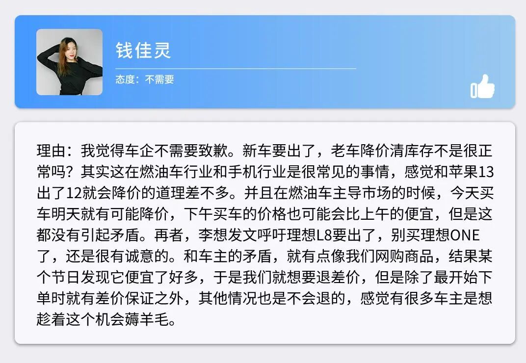 面对众多车主的投诉,理想给出的答复是会严格履行质保承诺,价格调整属于正常商业行为。但车主们并不满意,坚持自己的补偿要求如赔付2万元+终身质保等。