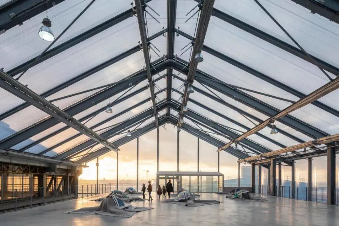 Lacaton & Vassal所设计的新结构保留了原有大厅的形式和规模,围护结构采用了柔软的生物气候膜,使人想起Buckminster Fuller的作品。