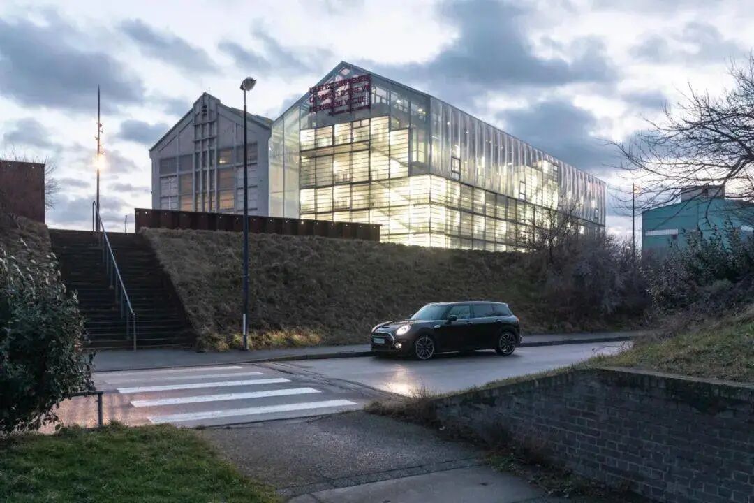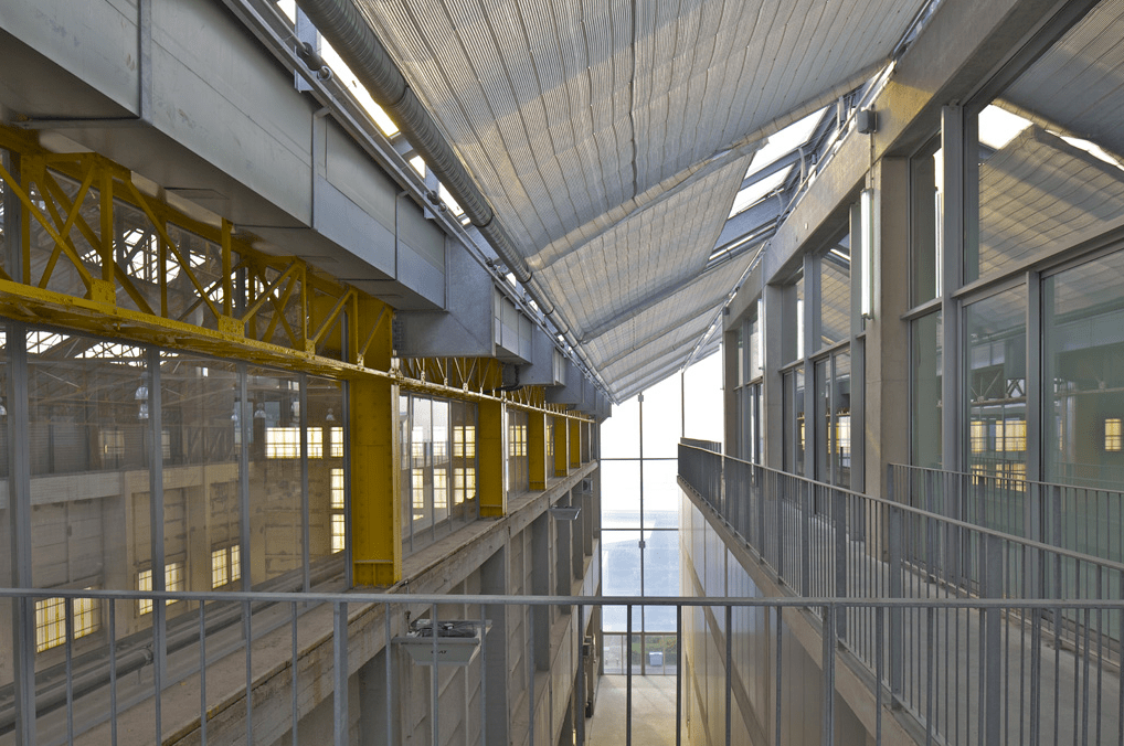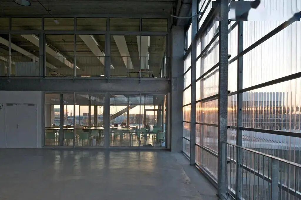 这两个独立的结构之间通过一个类似屋脊的结构连接在一起。如今的FRAC’s Halle 2就位于废墟之中,它的雄伟的大窗户和巨大的规模让这个标准化的制造工厂显得神圣,当地人称它为“大教堂”。
