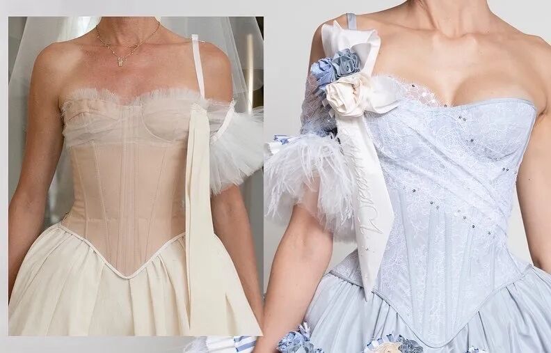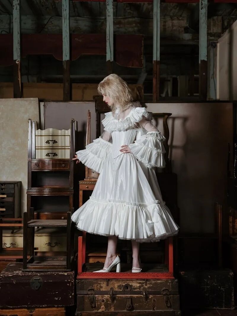 在纯白色面料的包裹之下,鲸须根根分明的勾勒出女性的轮廓,其间装饰的花朵和荷叶边尽显婚纱带给女子的神圣。从束缚、遮盖到装饰、显露,Wiederhoeft将服装赋予的柔情尽数展现在服装的结构与面料之中。