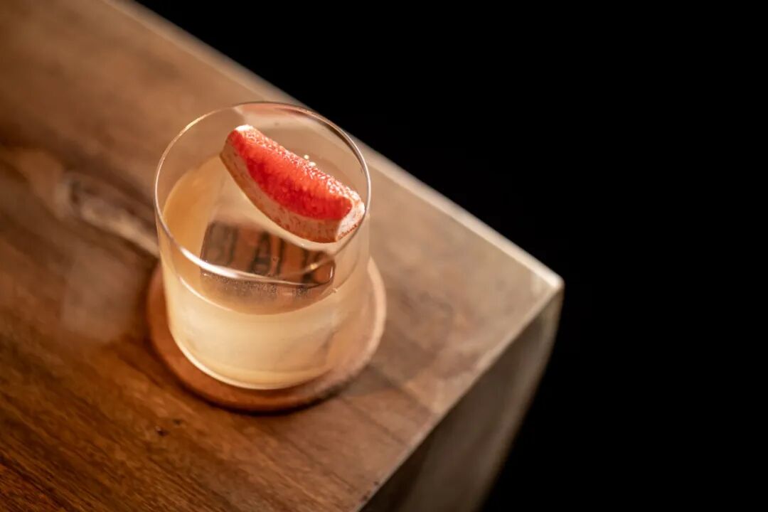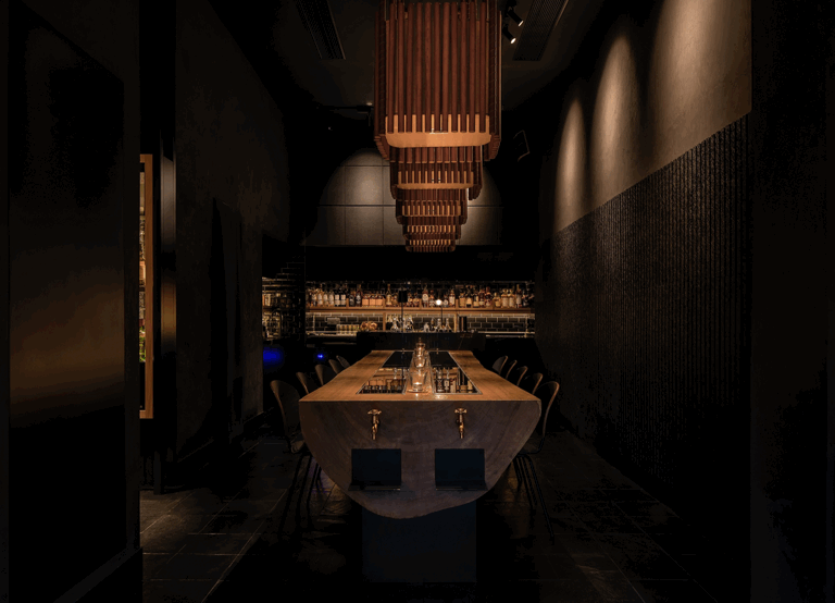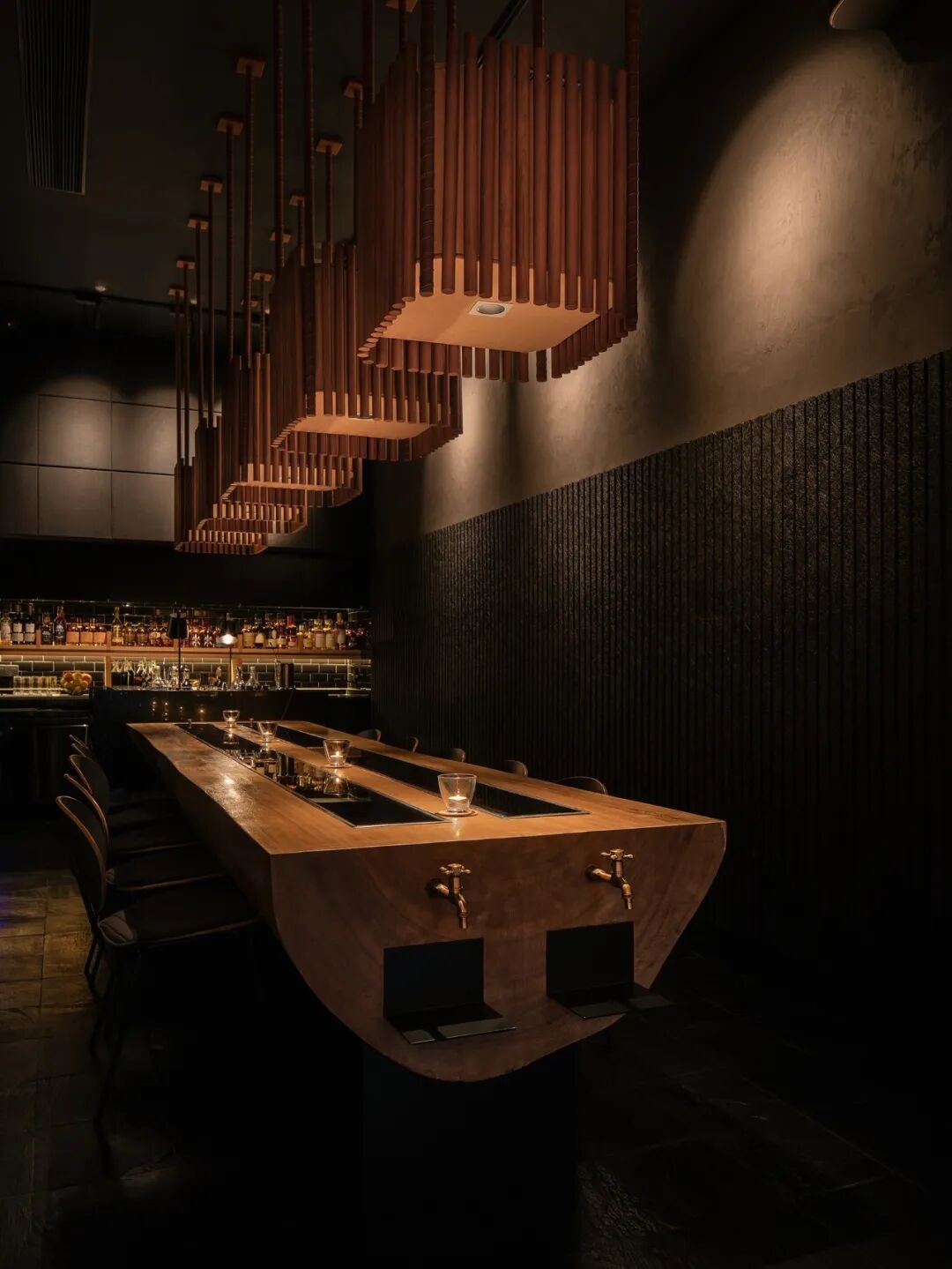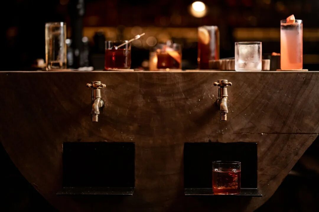 酒吧的中心是一个巨大原木树桩长桌。从巴布亚新几内亚进口的两吨重苏门答腊八果木上开凿了两条威士忌陈酿管道。被玻璃覆盖的管道分别连接 21升美国橡木桶和法国利穆赞橡木桶威士忌,可以直接从长桌顶端的龙头供应。