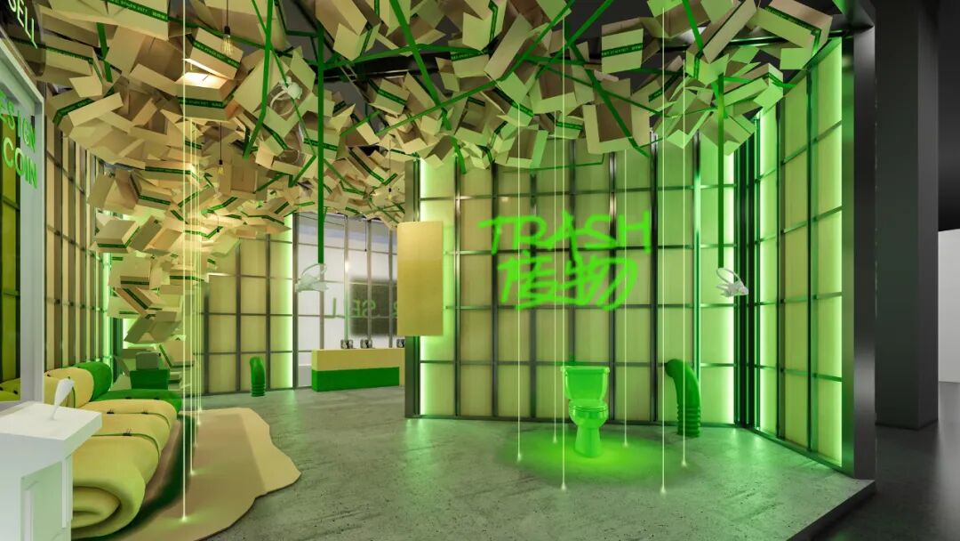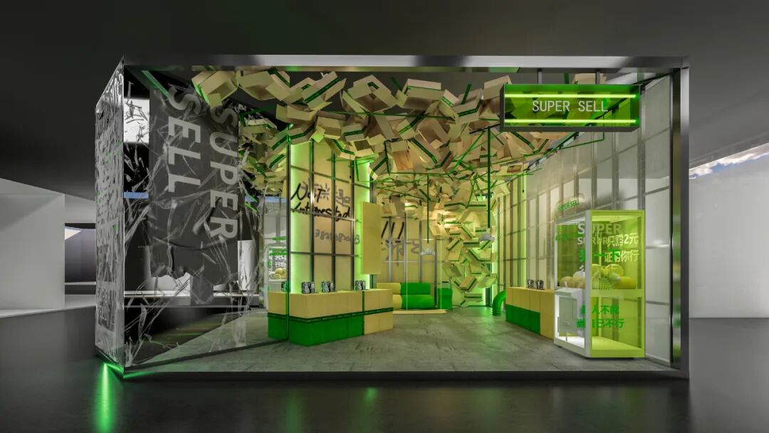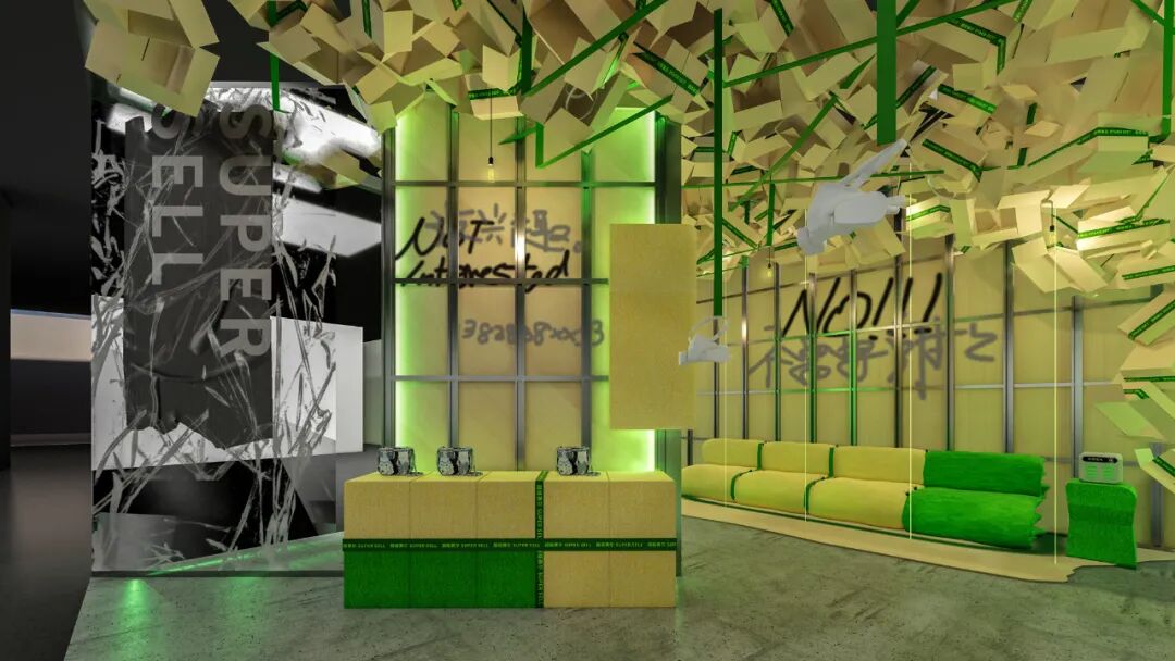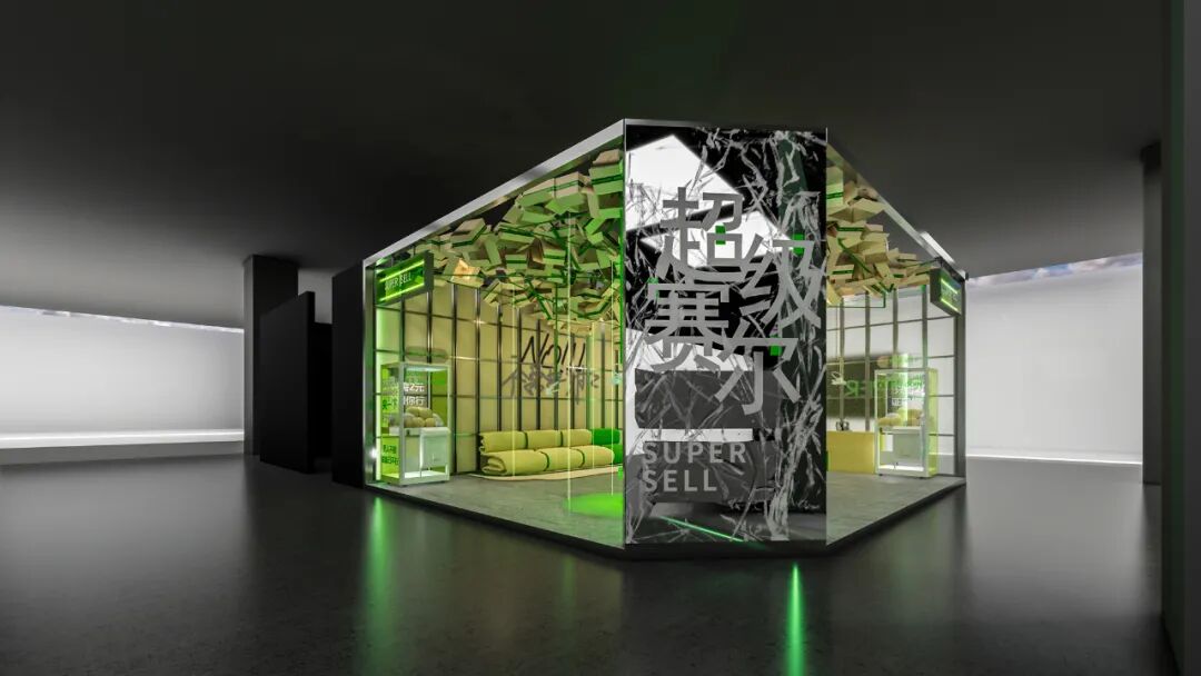此次空间主题展,策展人通过应用消费行为中的综合材料,构建了一种过度、荒诞的“消费后”空间,加之消费后材料制作的时尚商品,利用消费“前”“后”这矛盾构成了“超级赛尔”的空间文本。策展人希望通过这一“过剩”的空间同观者探讨“过度”消费、“过度”享乐、“过度”设计的结果,同时发想情绪价值加持零售的可能性。