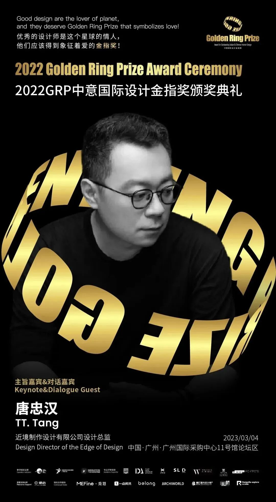 2022GRP中意国际设计金指奖年度颁奖典礼现场,将特别邀请国内著名设计师、近境制作设计总监——唐忠汉老师进行“爱与设计”主旨演讲。 他将基于自身对设计要义的深刻理解,从爱与设计的多元关联角度,展望国内设计行业承前启后的美好图景。
