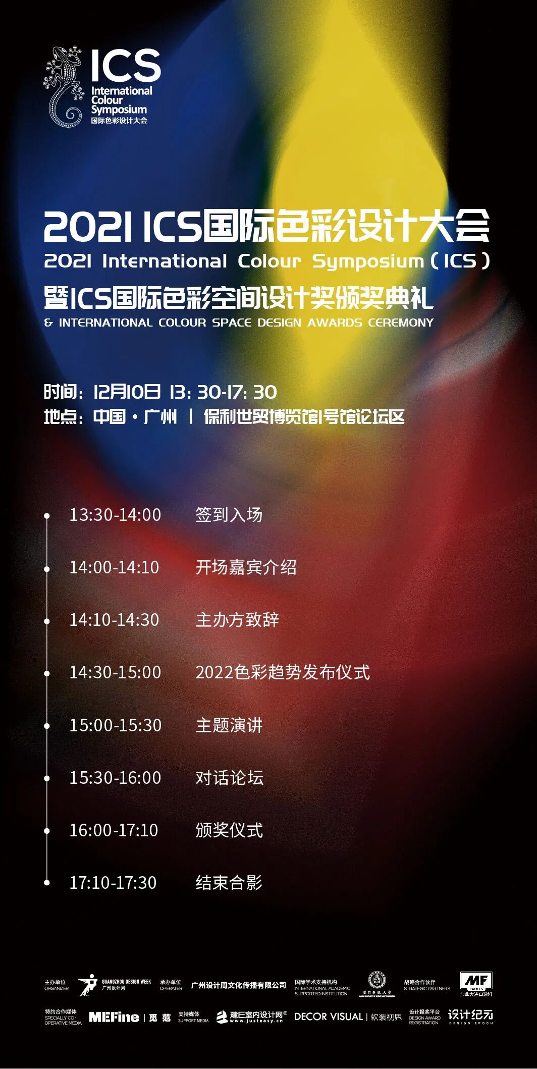 2021 ICS国际色彩空间设计奖颁奖典礼将于12月10日在广州·保利世贸博览馆1号馆论坛区盛大举办,届时趋势委员将莅临现场为“年度优秀色彩空间设计奖”和“年度最佳色彩空间设计奖”获奖者颁发奖杯及证书,同时将在现场隆重揭晓“年度十佳色彩空间设计师”殊荣!期待与你共同见证!