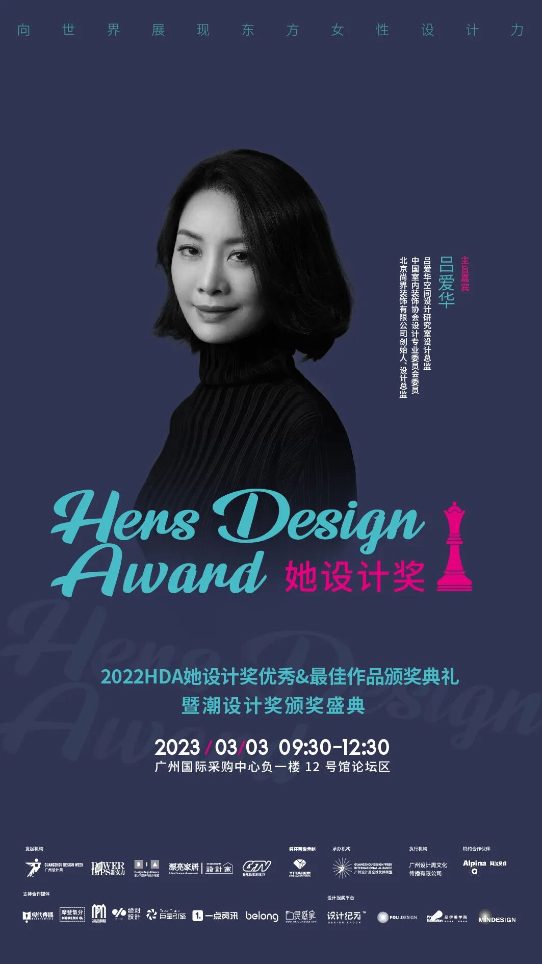“HDA她设计奖”致力于向世界展现东方女性设计力,由广州设计周、新女力Power Lips、漂亮家居设计家媒体、意大利品牌与设计联盟、Global Fashion TV等中外主流设计与时尚产业资源与传媒平台于2019年共同发起,旨在通过表彰在室内空间、软装陈设、时尚艺术领域等蕴含创造力的女性设计作品,发掘和激励更多杰出的东方女性设计师,并联动以意大利为主的国际时尚/家居/设计产业界,展开东西方设计文化与商业价值的交流与合作,让东方女性设计之美闪耀于世界舞台。