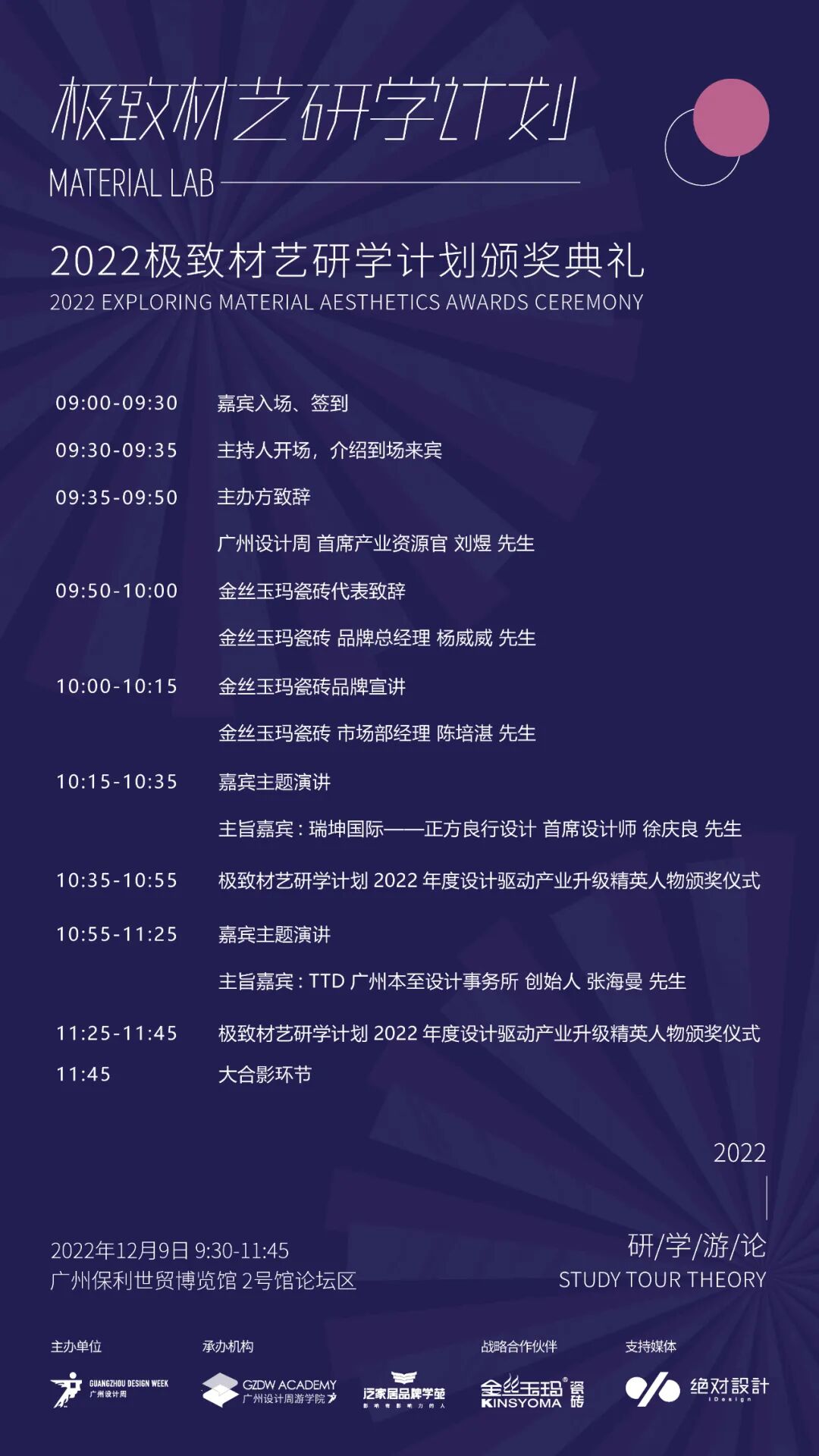 作为“极致材艺研学计划”的重磅收官活动,2022极致材艺研学计划颁奖典礼将面向2022年极致材艺研学计划的研学学员公开进行参评,表彰以观念创新带动产业升级发展,为国家创意产业塑造创新发展模式,为中国设计跨越式发展树立“样板工程”的“设计驱动产业升级精英人物”,并现场进行荣誉颁发。