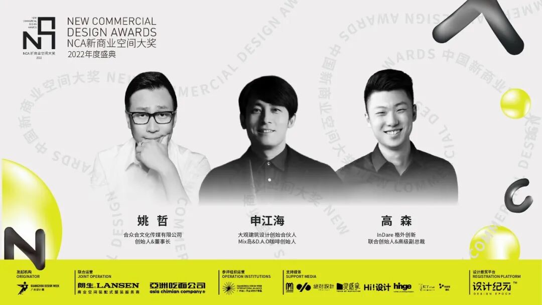 作为新商业空间的交流盛宴,「NCA新商业空间大奖 2022年度颁奖典礼」特别邀请了合众合文化传媒有限公司创始人&董事长 姚哲先生、大观建筑创始合伙人&设计总监 申江海先生、inDare 联合创始人 高森先生担任主旨嘉宾,为我们分享关于他们打造新商业空间、引领新潮流消费的设计密码,助力商业空间的“革新”计划。
