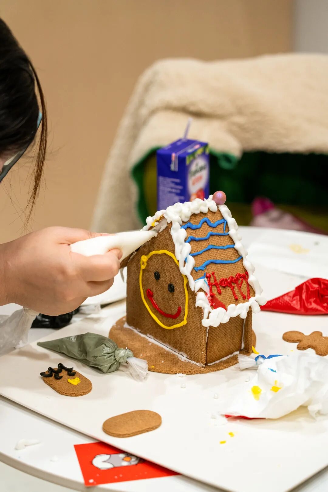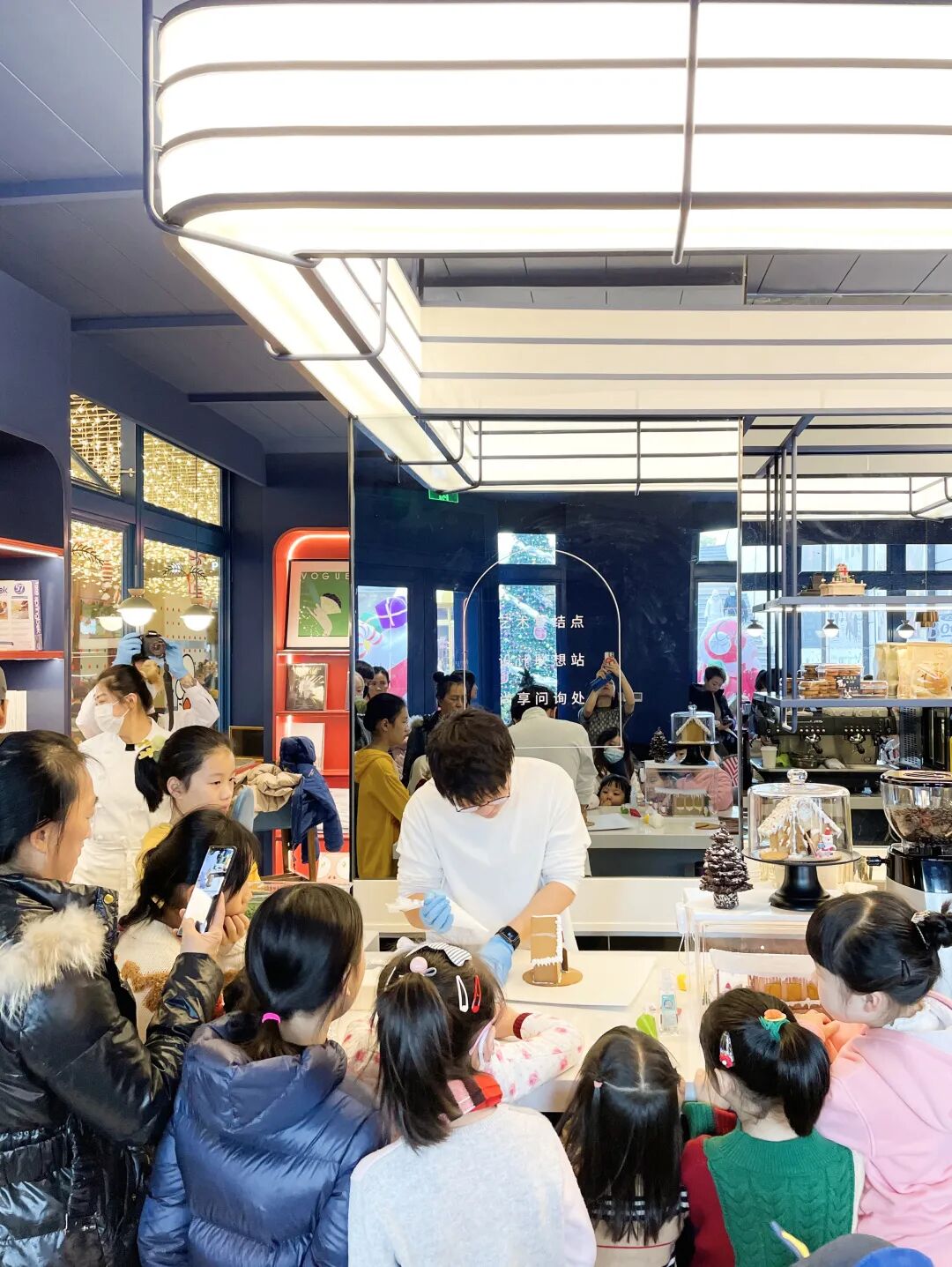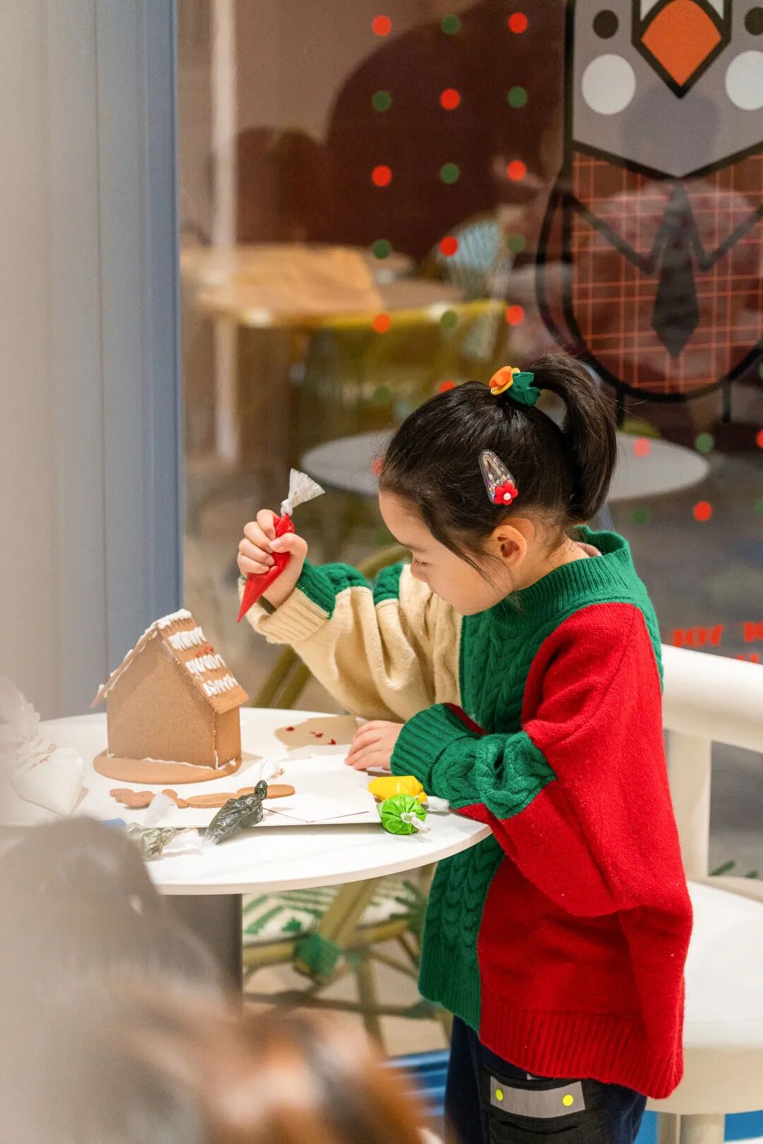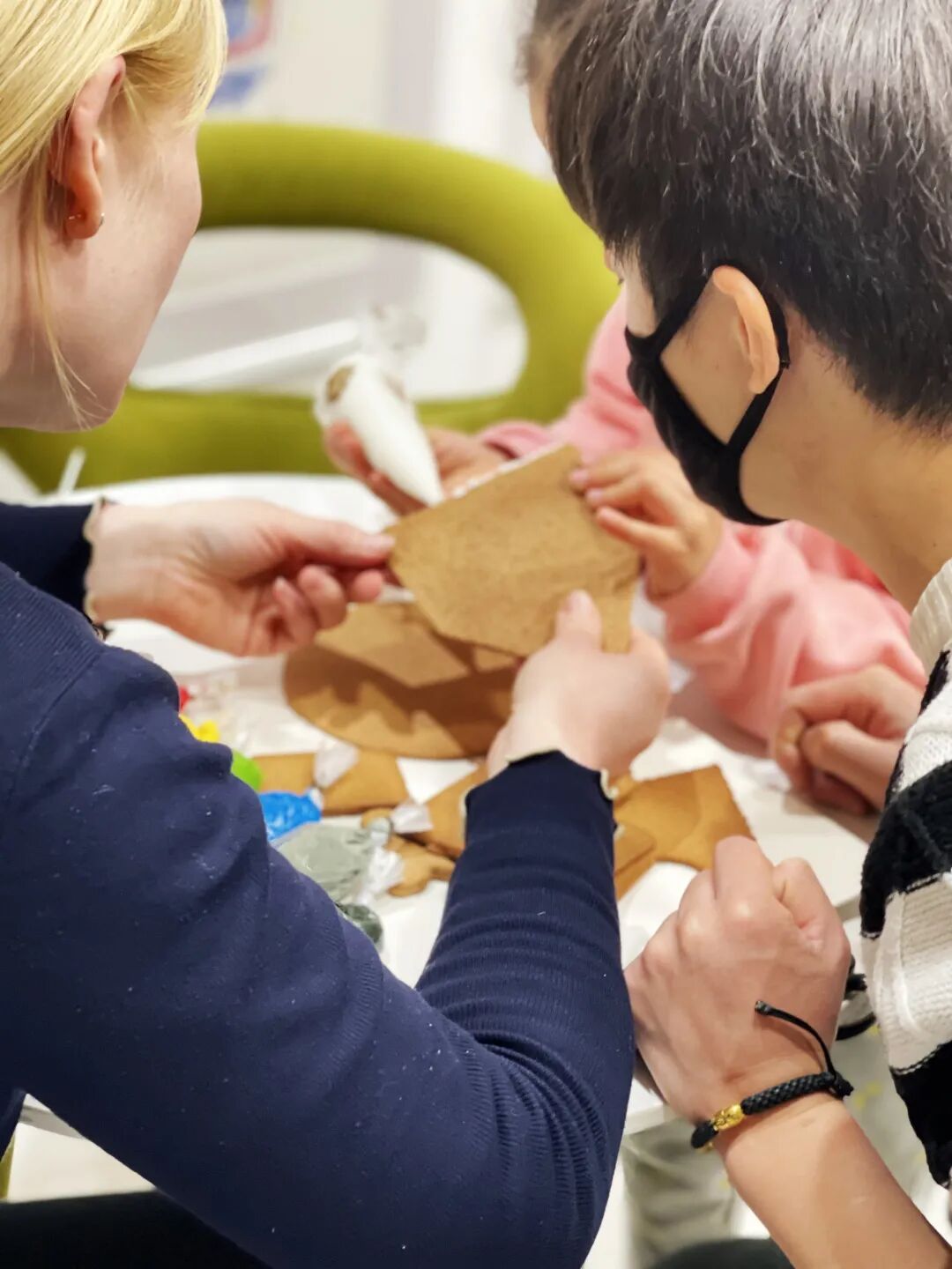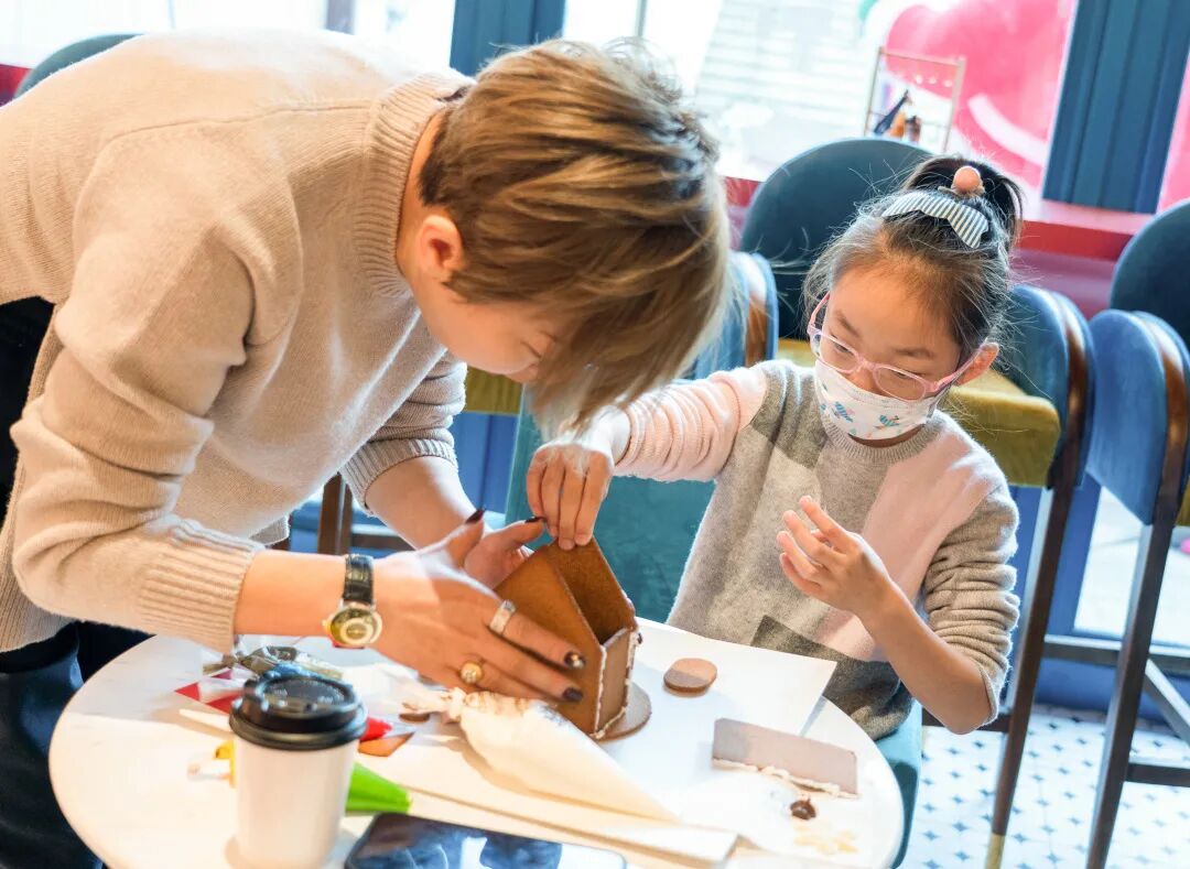 姜饼工坊现场,18组家庭在Kin老师的指导下搭建其属于自己的姜饼小屋,并将自己对于圣诞节的美好想象通过奶油、巧克力的不同组合装点于小屋之上,打造出了一个个极具想象力的圣诞姜饼小屋。