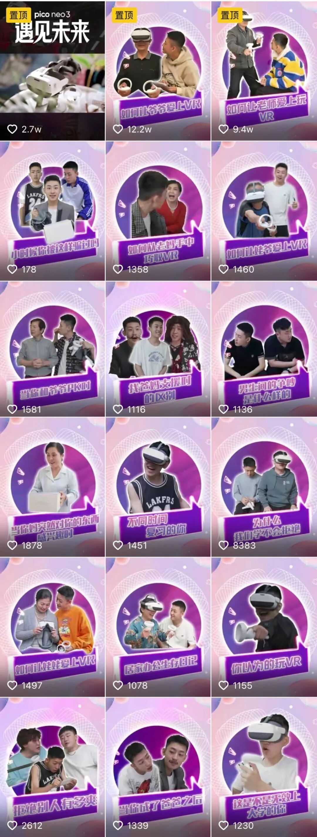 Pico VR账号中,播放量达到840万的“Pico的用户体验计划”合集中,分别讲述了如何让同事的爸爸爱上VR,如何让钓友爱上VR、如何让表姐爱上VR、如何给舅舅安利VR、如何给相亲对象安利VR、如何让NPC爱上VR.......都是平铺直叙地讲述生活中的VR娱乐场景,让不同年龄层、不同职业、不同兴趣的人都看到VR游戏的乐趣,最大限度的拓宽VR人群。