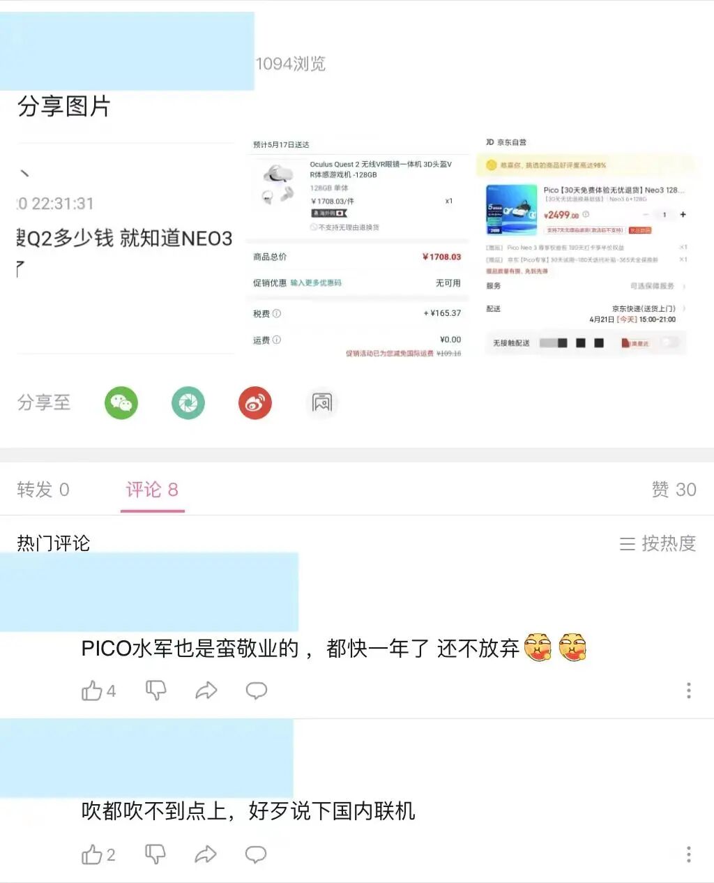 发稿前一天,WGzeyu在社交媒体分享了三张图片,一张是某用户发表的“快去搜搜Q2多少钱,就知道Neo3有多香了”动态截图,另外两张是他自己的订单截图,截图显示Quest 2和Neo3分别花费1873.4元(含税)、2499元。评论区有几位玩家均对此表示鄙夷。