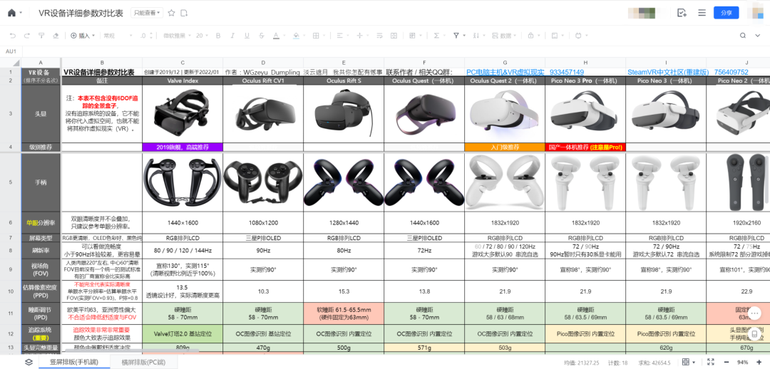 他管理着一个共享文档《VR设备详细参数对比表》,横向对比了45款VR设备的关键参数,并做了优缺点对比。