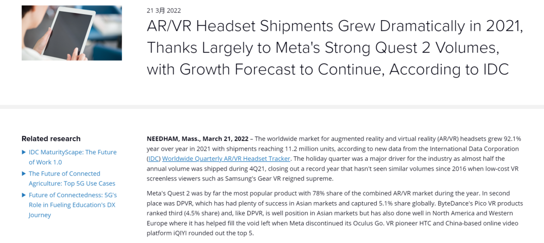 IDC近期发布的《2021年第四季度全球AR/VR头显市场季度跟踪报告》显示,2021年全年全球AR/VR头显出货量达1123万台,市场同比增长 92.1%,其中VR头显出货量达1095万台。Oculus份额达到78%,排名第二的是国产DPVR占5.1%份额,Pico以4.5%的份额位列第三。