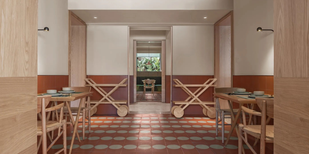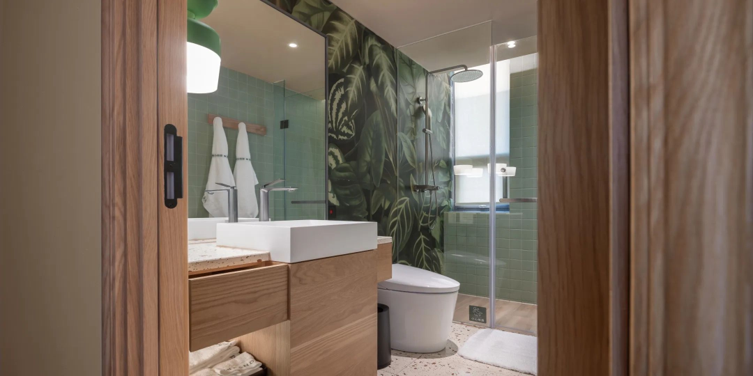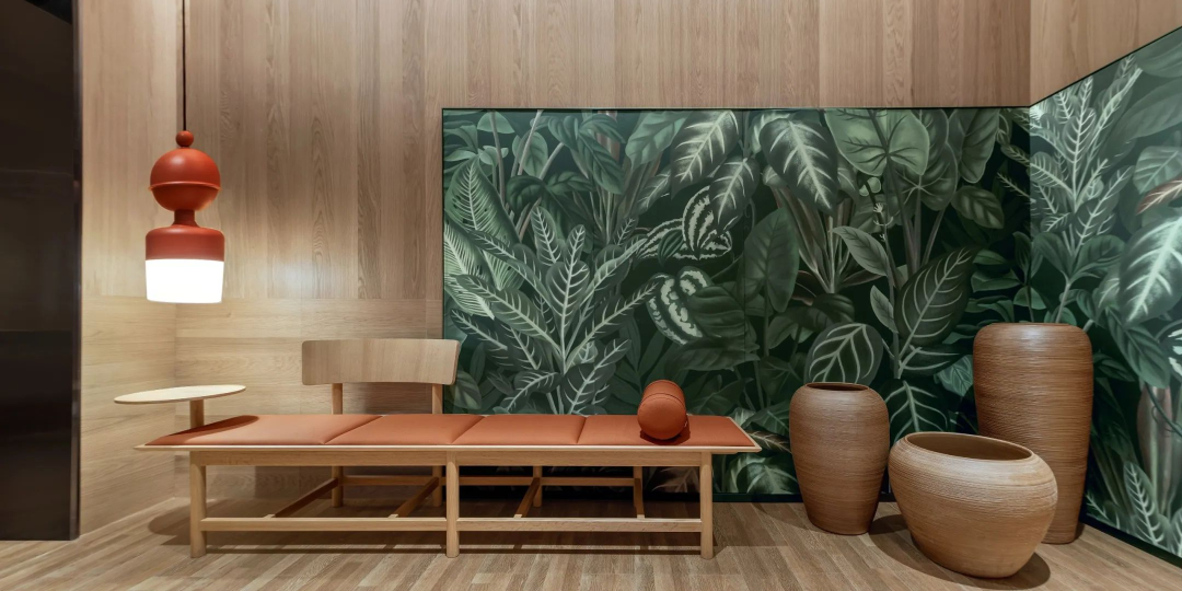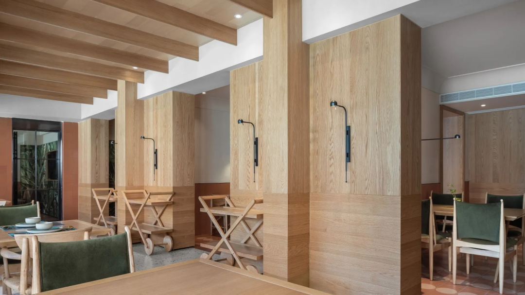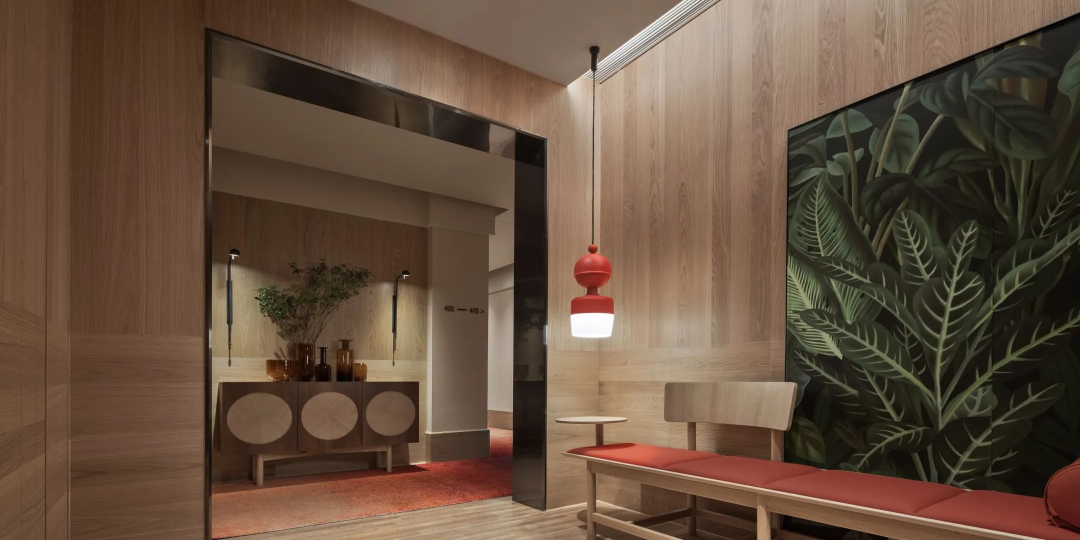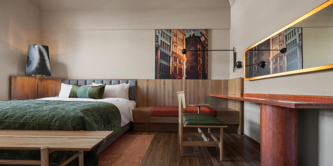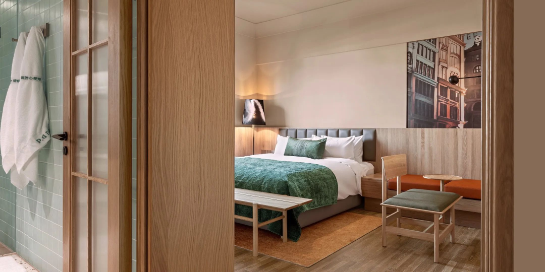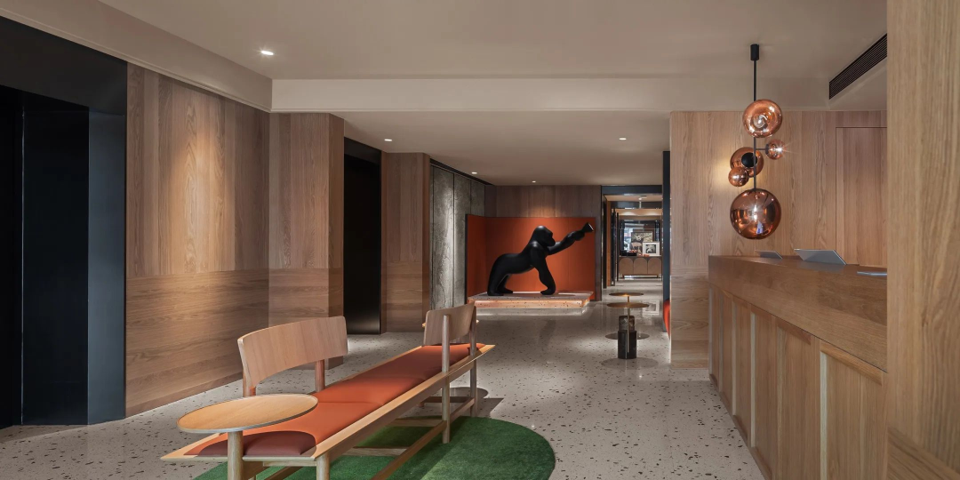 酒店外观保留原来的红砖墙,利用原本的建筑进行改造,使其原汁原味地融入街区;内部巧妙地运用可变空间的设计创意,合理划分功能区间,满足基本的休息诉求;自然绿与复古红被设计师巧妙地引入室内,非常贴合“老旧新生”的概念,整体的木质风散发温暖、生机,为都市人提供一个心灵栖息的地方。