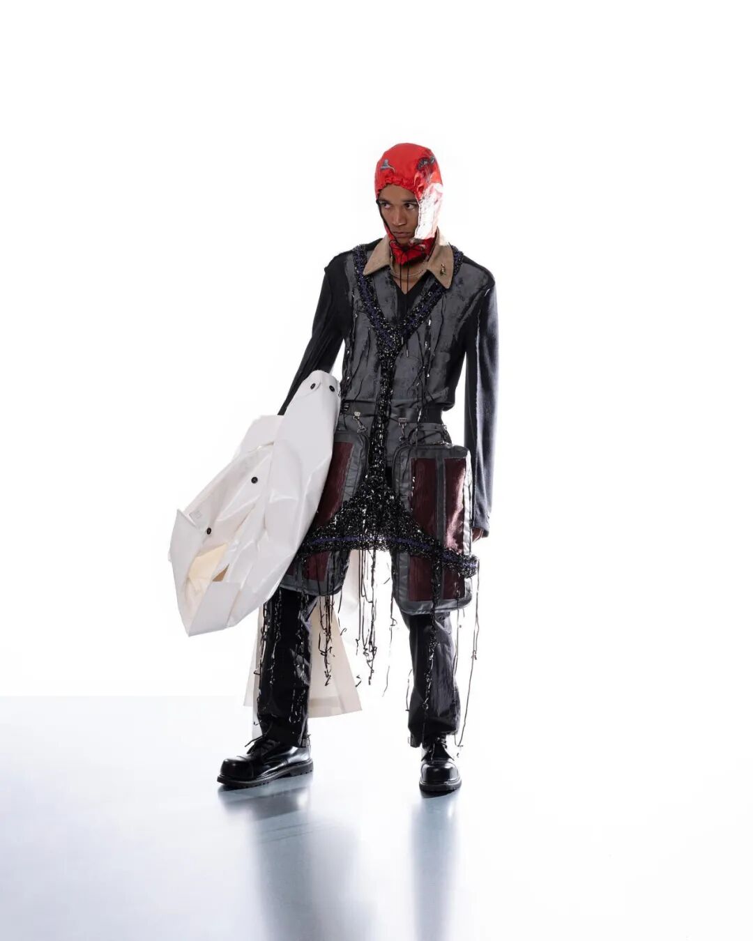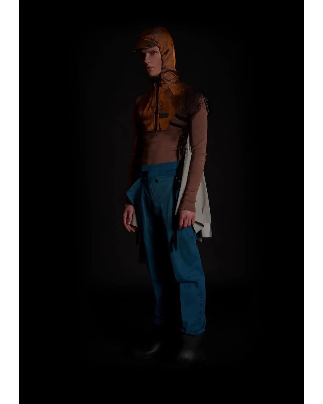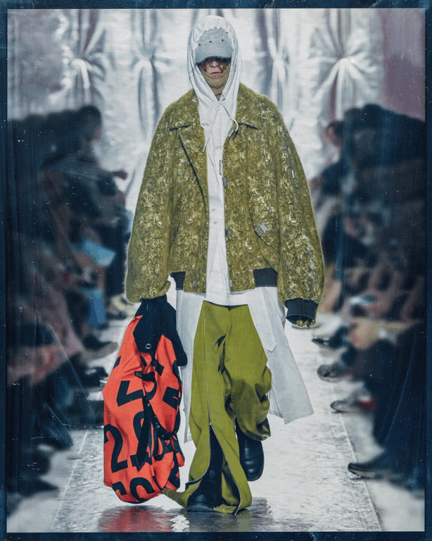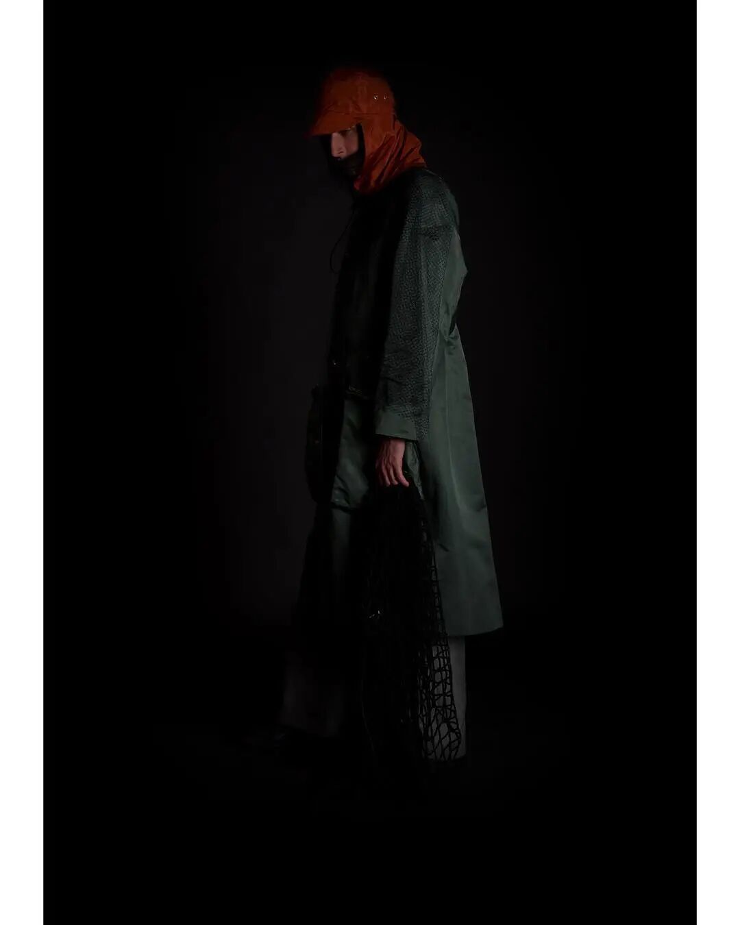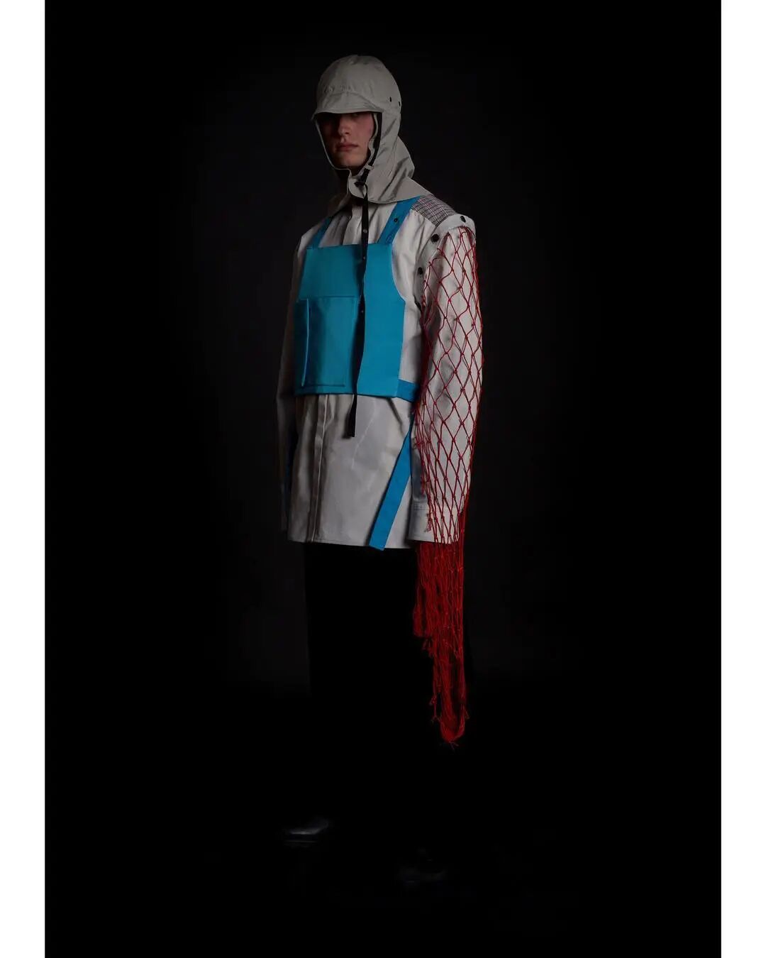 本系列的廓形灵感来自于北海地区穿着厚重的羊毛和油蜡服装的老渔夫。强烈的彩色服装与赤褐色、手工漂白面料的反差营造出氧化拖网渔船的氛围,再结合可拆卸渔网、雨罩以及功能性的安全带的细节,渔民在勇敢的新世界中为各种天气条件做好准备的复古未来主义形象跃然眼前。