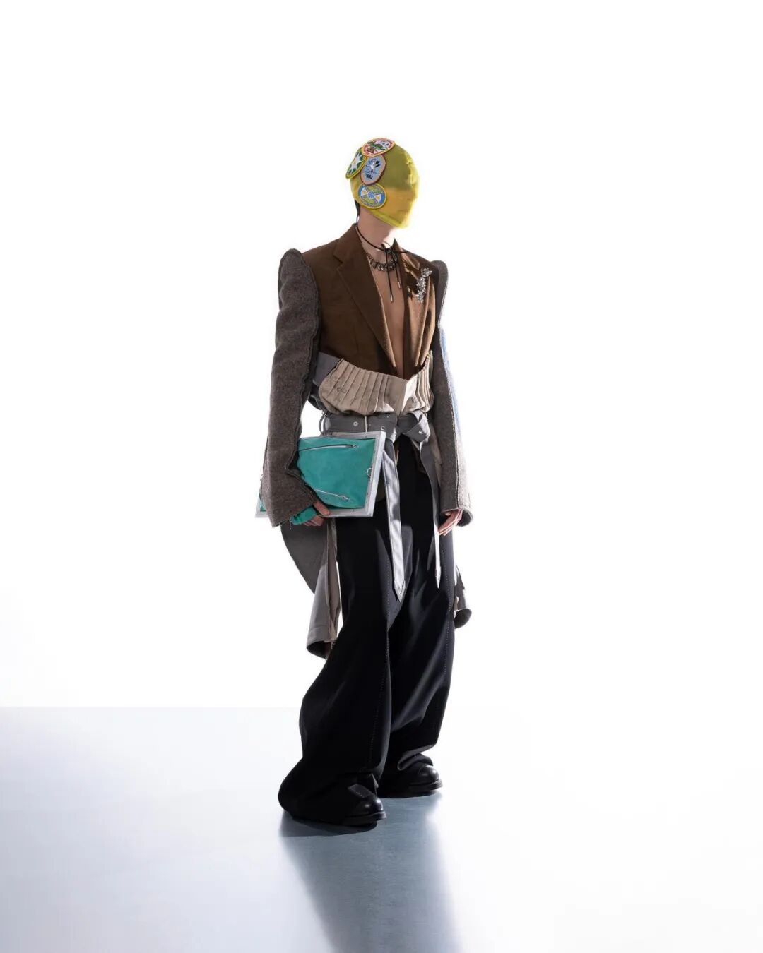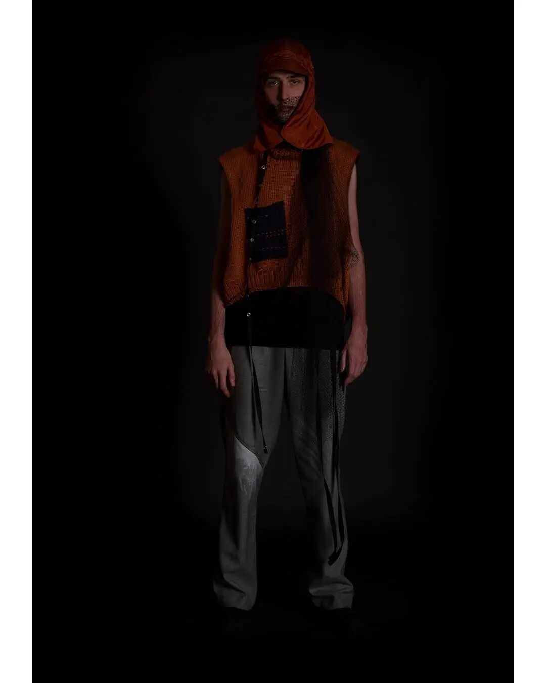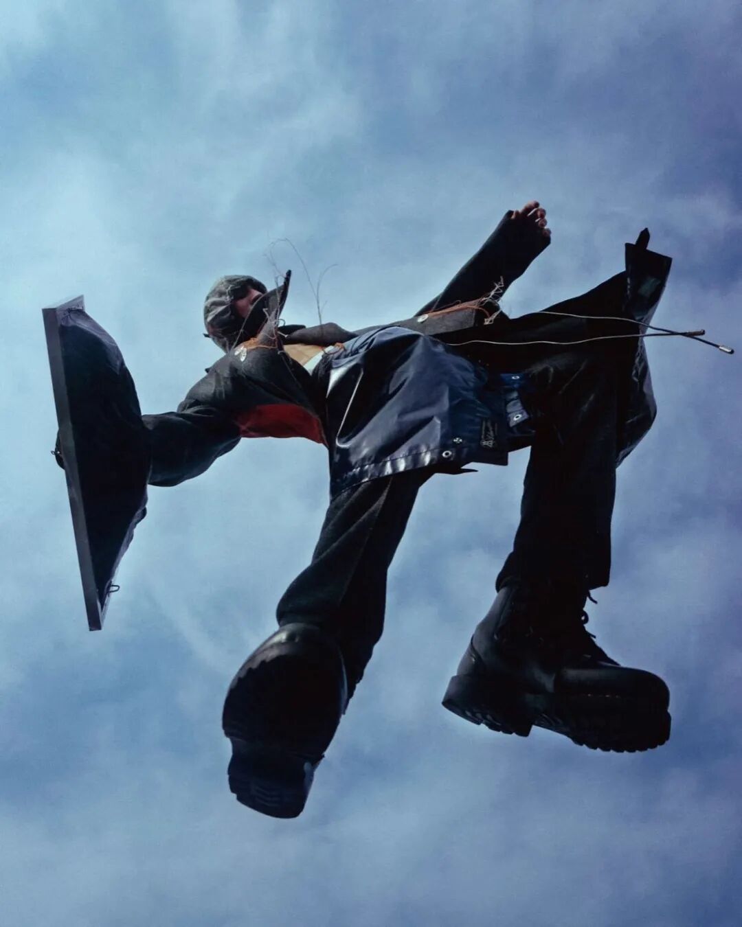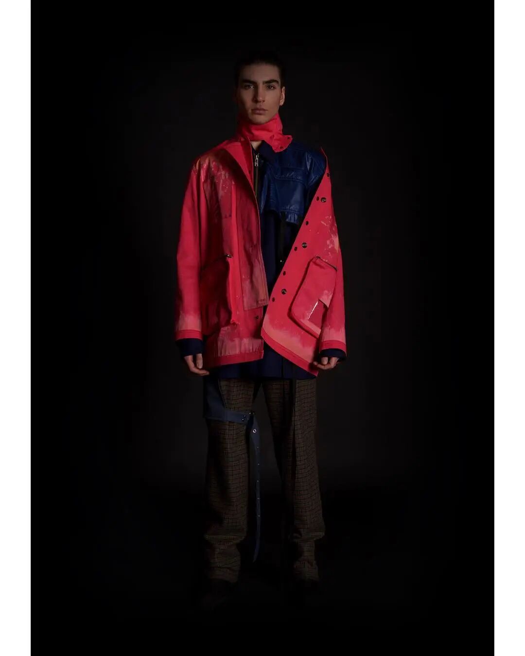 本系列的廓形灵感来自于北海地区穿着厚重的羊毛和油蜡服装的老渔夫。强烈的彩色服装与赤褐色、手工漂白面料的反差营造出氧化拖网渔船的氛围,再结合可拆卸渔网、雨罩以及功能性的安全带的细节,渔民在勇敢的新世界中为各种天气条件做好准备的复古未来主义形象跃然眼前。