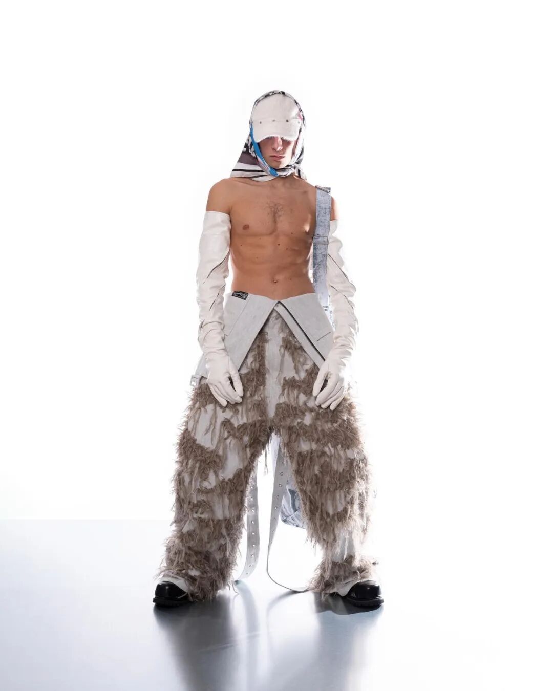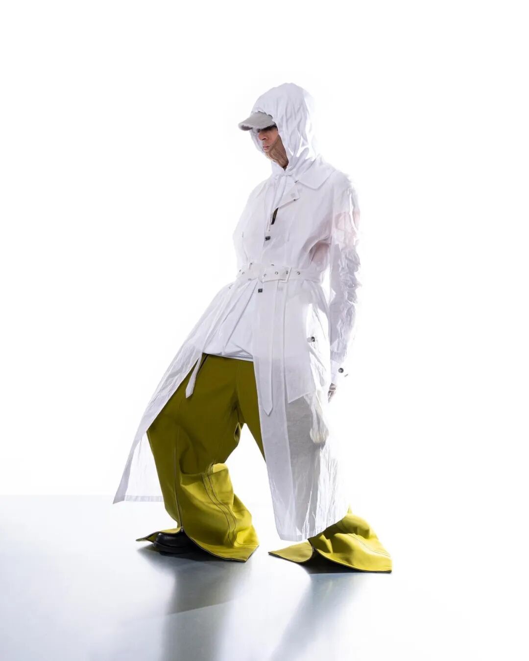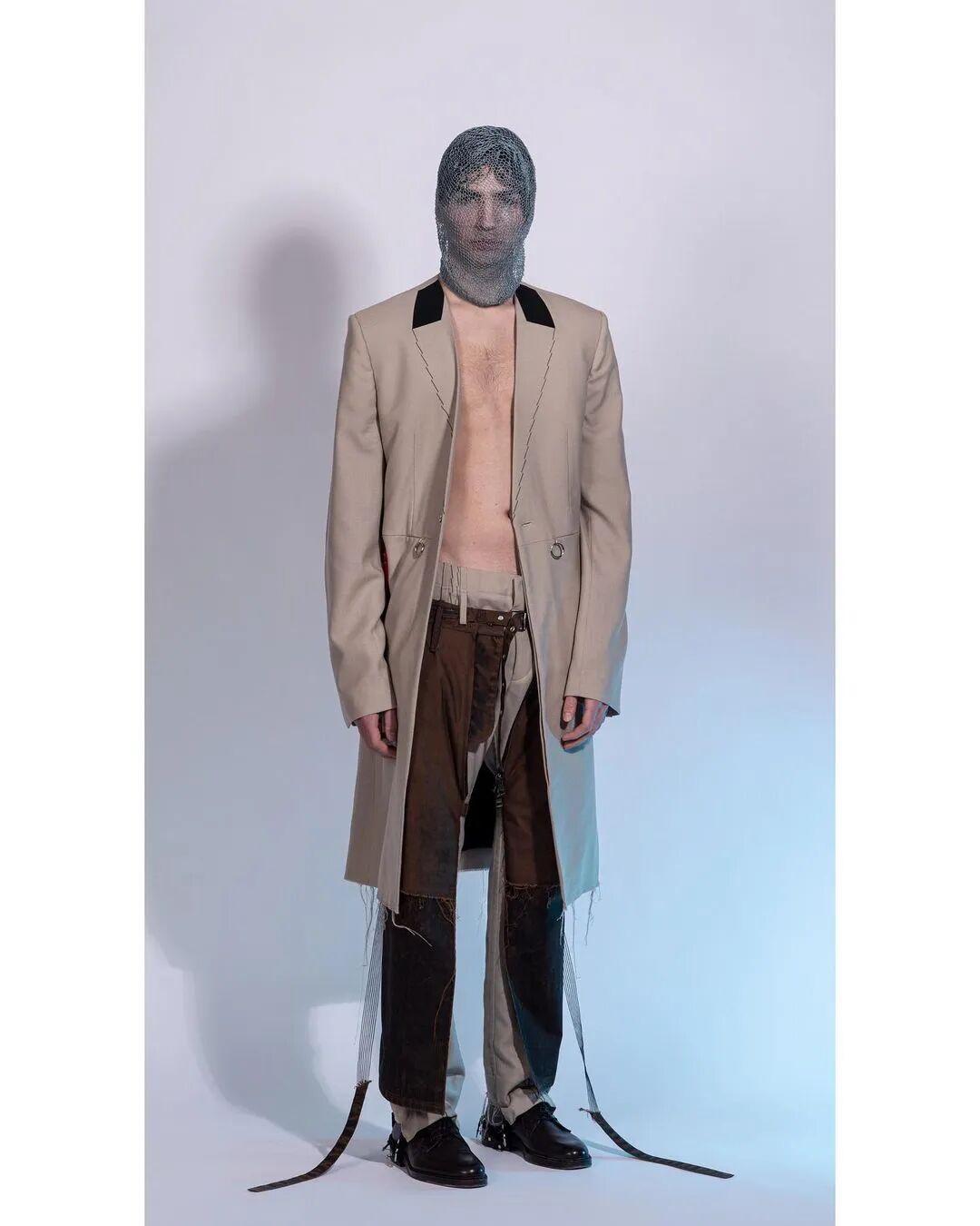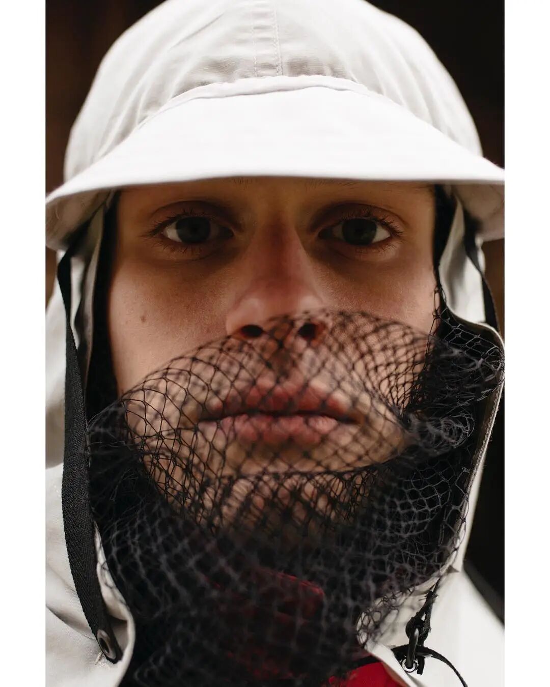本系列的廓形灵感来自于北海地区穿着厚重的羊毛和油蜡服装的老渔夫。强烈的彩色服装与赤褐色、手工漂白面料的反差营造出氧化拖网渔船的氛围,再结合可拆卸渔网、雨罩以及功能性的安全带的细节,渔民在勇敢的新世界中为各种天气条件做好准备的复古未来主义形象跃然眼前。