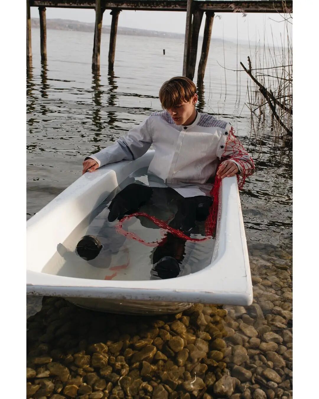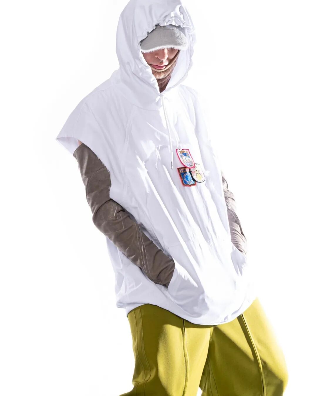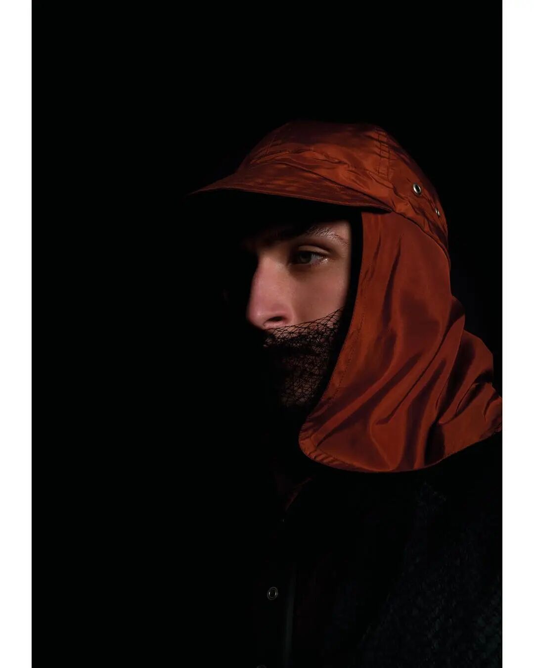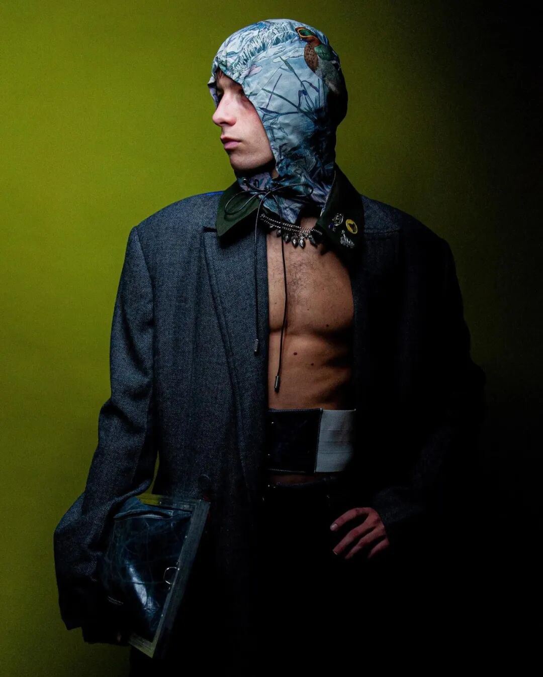 本系列的廓形灵感来自于北海地区穿着厚重的羊毛和油蜡服装的老渔夫。强烈的彩色服装与赤褐色、手工漂白面料的反差营造出氧化拖网渔船的氛围,再结合可拆卸渔网、雨罩以及功能性的安全带的细节,渔民在勇敢的新世界中为各种天气条件做好准备的复古未来主义形象跃然眼前。