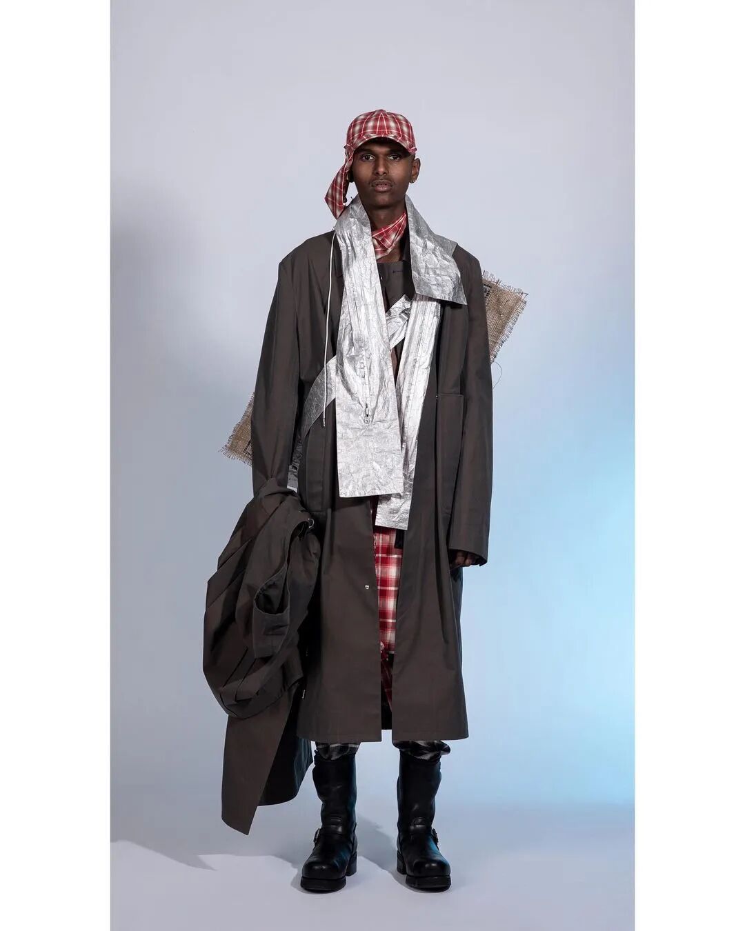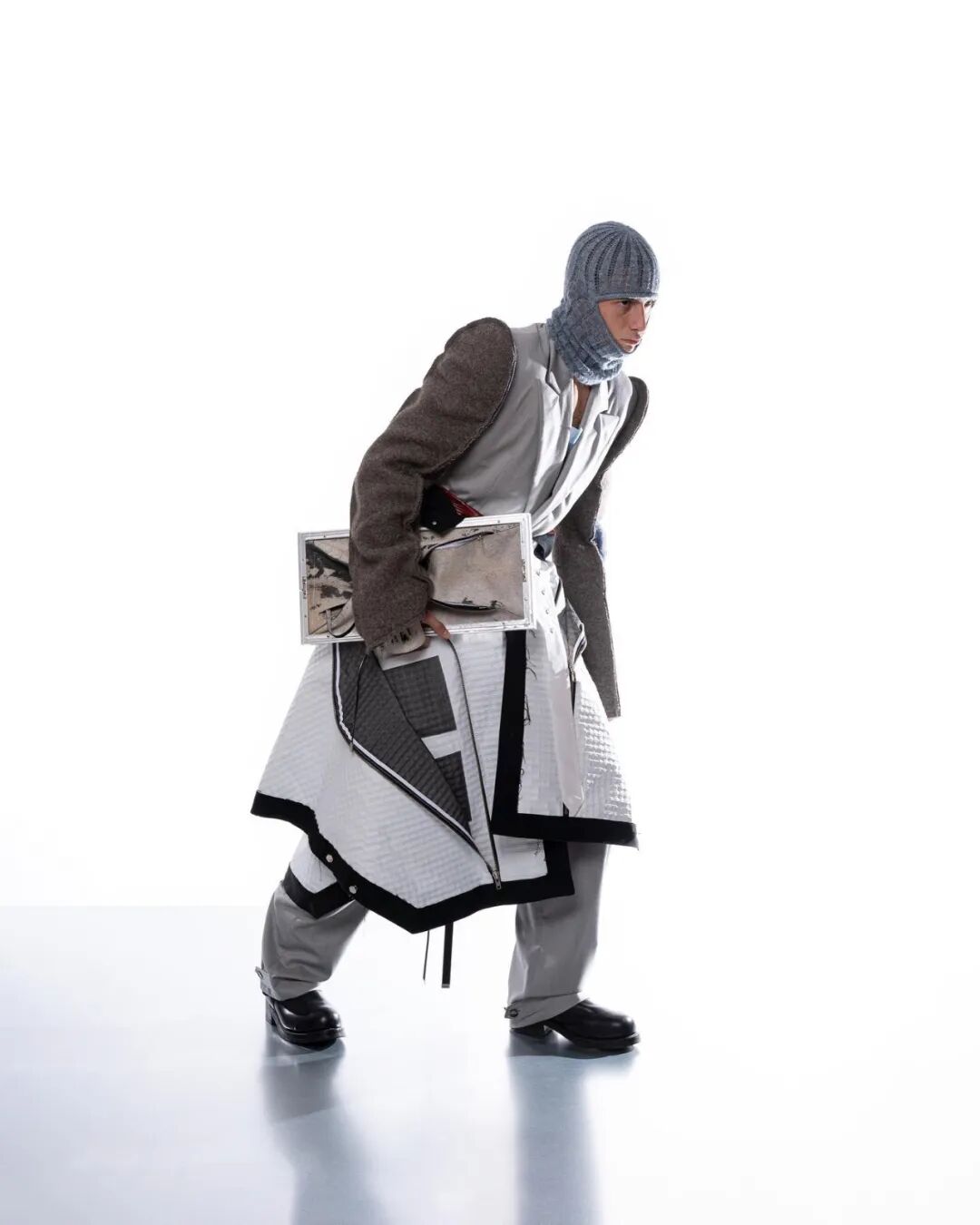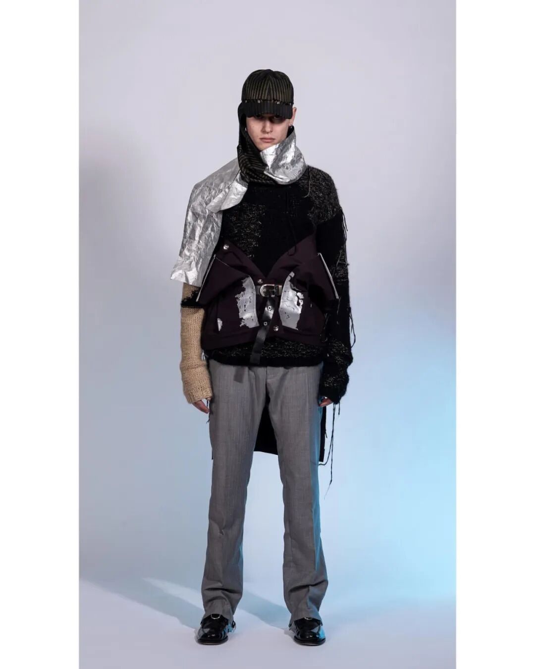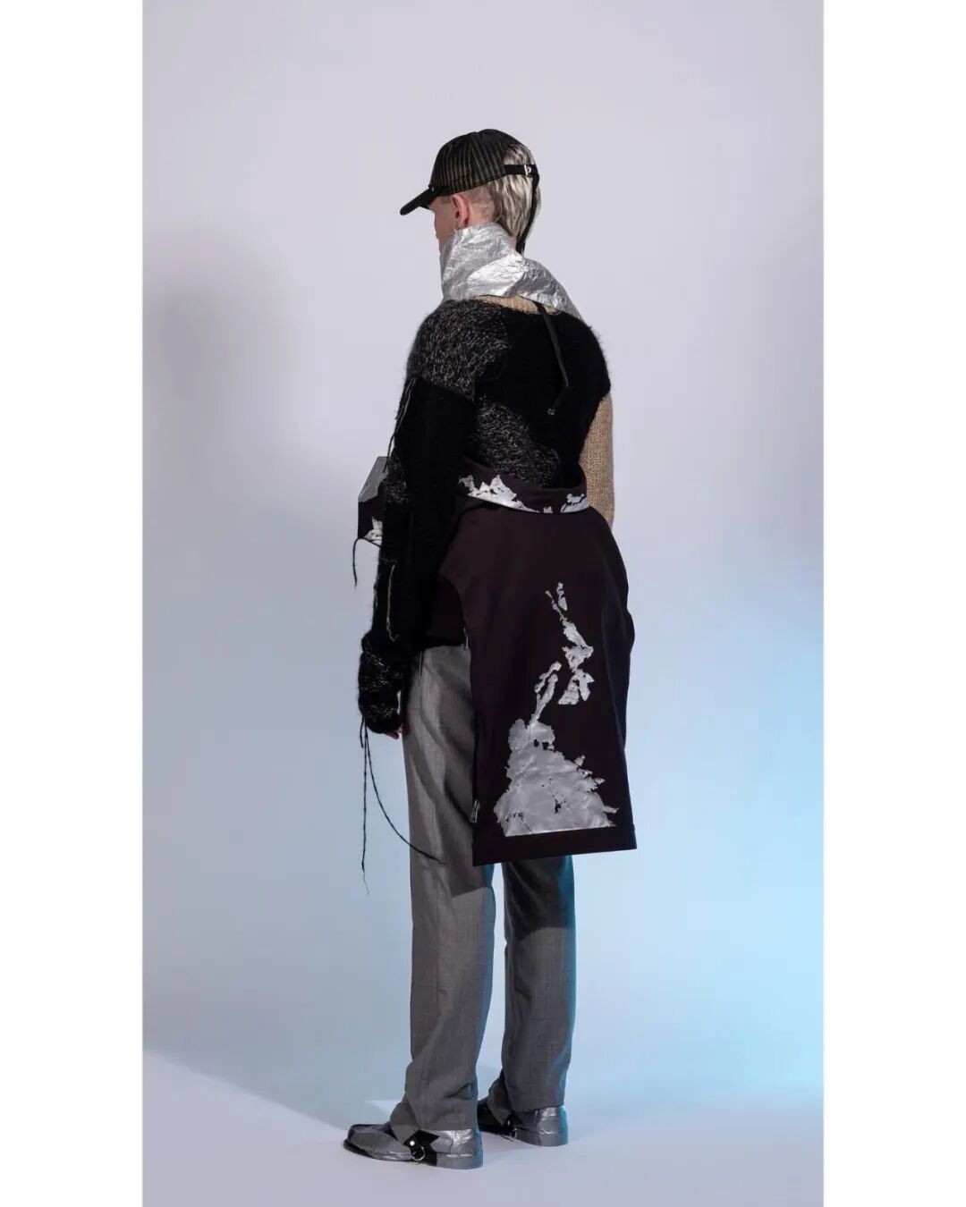 Oversized空气动力学廓形、前卫的做旧和成型技术、铝涂层材料与升级再造边角材料的应用,Valentin意图制作耐用、优雅和实用的服装。无须置疑的是,他是不折不扣的反乌托邦主义倡导者。
